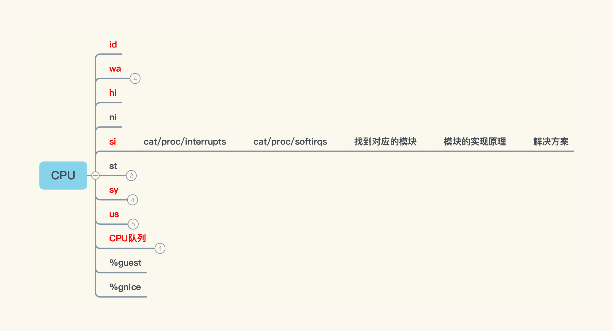 根据图中展示的逻辑,当我们看到%si(软中断)高时,就去查看cat/proc/interrupts目录。其实对于这个软中断,有两个目录可以体现出来,一个是cat/proc/interrupts,另一个是cat/proc/softirqs。前者不仅包括软中断,还包括硬中断,如果我们看到软中断高,其实直接看cat/proc/softirqs就可以了。
