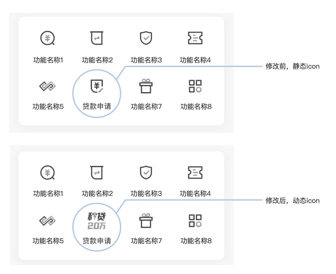 虽然这款产品申请处于首页的金刚位,但金刚位包含着8个功能的入口icon。也就是说,这8个功能放在一起,要发现这个贷款产品是有一定难度的。基于这个问题,我们把App入口的icon从静态改成了动态,并且加上了极具吸引的文案“秒贷20万”。