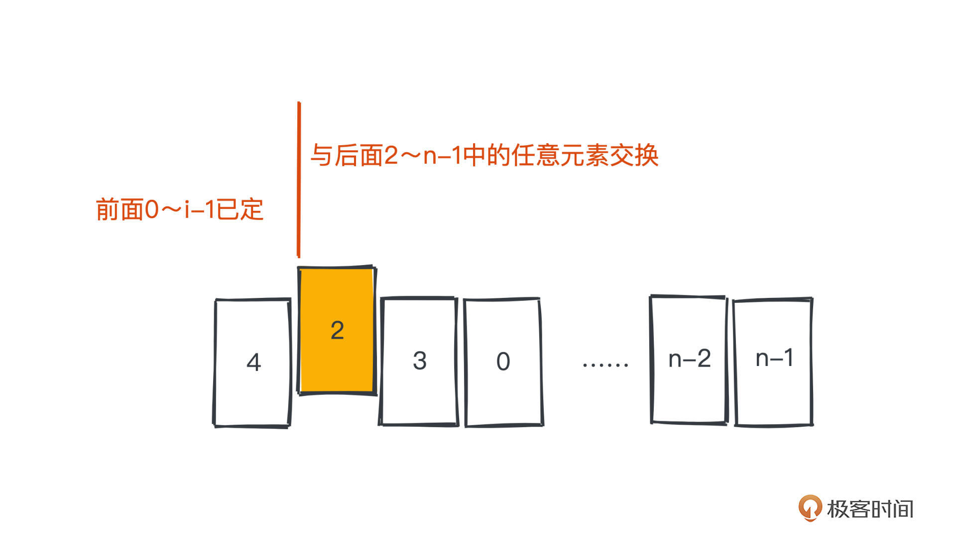 仍然逐位进行选择,但是当我们在选择第i位的时候,会假设0~i-1位已经确定,那么i的可选范围其实就是当前数组的第i~n-1位,于是我们只需要把第i位元素和第i~n-1位元素中的任意一个元素交换,就可以实现随机选择的效果。