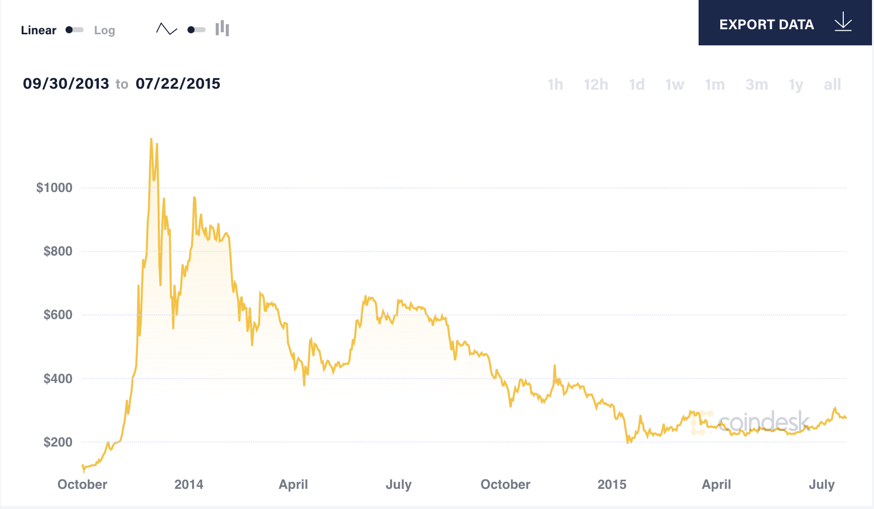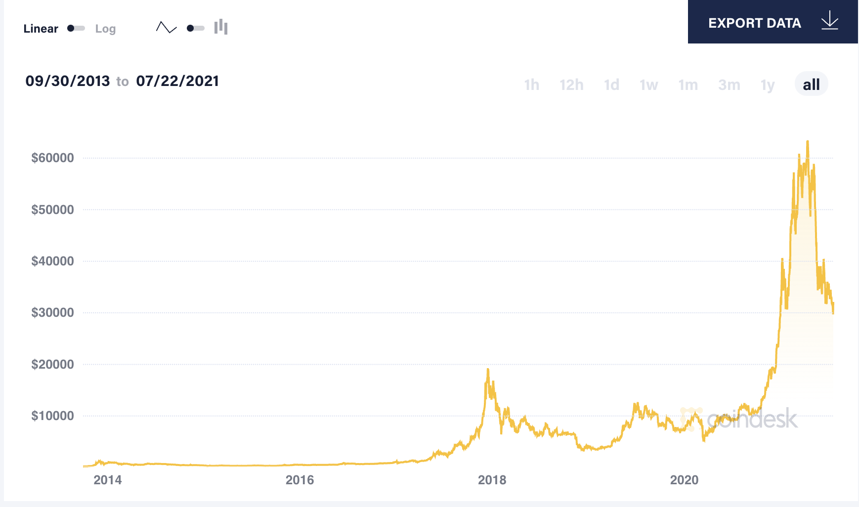 - 下面,我给出了比特币最近7年的走势,通过这个走势图(来自coindesk),你能发现什么规律?如果让你根据这个规律,制定一个当前的长期投资策略,你会怎么制定?