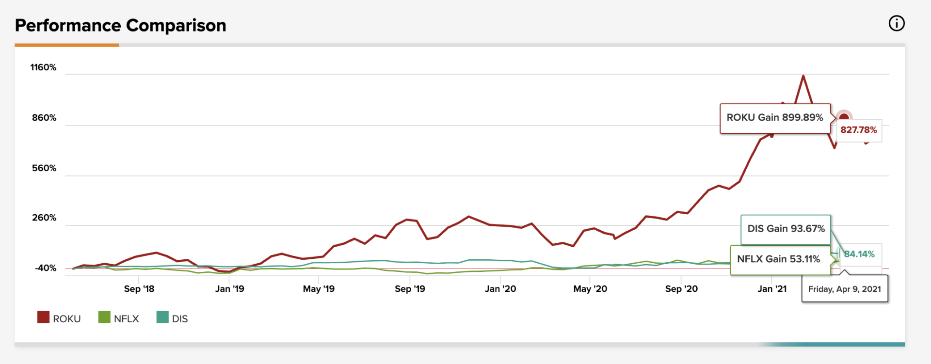 所以从增长的角度来说,Roku的潜力显然是最大的。那么基于我对行业的分析,我们就应该购买Roku的股票。而我的做法更加极端一点:我直接选择了加入Roku,通过获得公司授予的股票来享受我专业信息优势的收益。观察图 2 中这三家公司自2018年的股票走势,你可以看到Roku的股票增长了899.9%,而Netflix和Disney的股票分别增长了53.1%和93.7%。从收益结果看,我当时的决策是正确的。