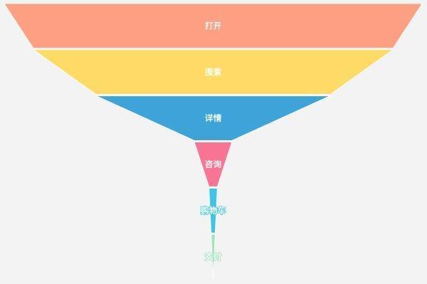 和一般的电商网站类似,X网站的常规转化过程也是:用户打开App,搜索关键词查找想要的商品,浏览商品搜索结果列表,点击某个商品,查看该商品的详细信息,如果有购买意向,可能会进一步咨询客服人员,然后放入购物车,最后对购物车所有商品进行支付,产生有效订单。X网站的转化漏斗如下。