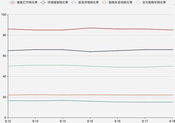 以此类推,每个环节都可以计算其转化率,将这些转化率的近期历史数据绘制在一张折线图上,就可以看到各个环节转化率的同期对比视图。