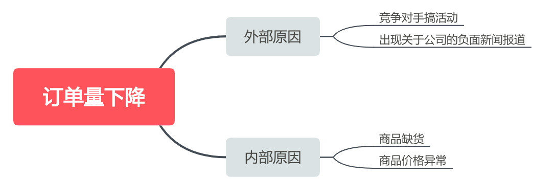 上面案例中一开始运营人员自己寻找订单量下降原因的时候,其实就用了金字塔分析方法。