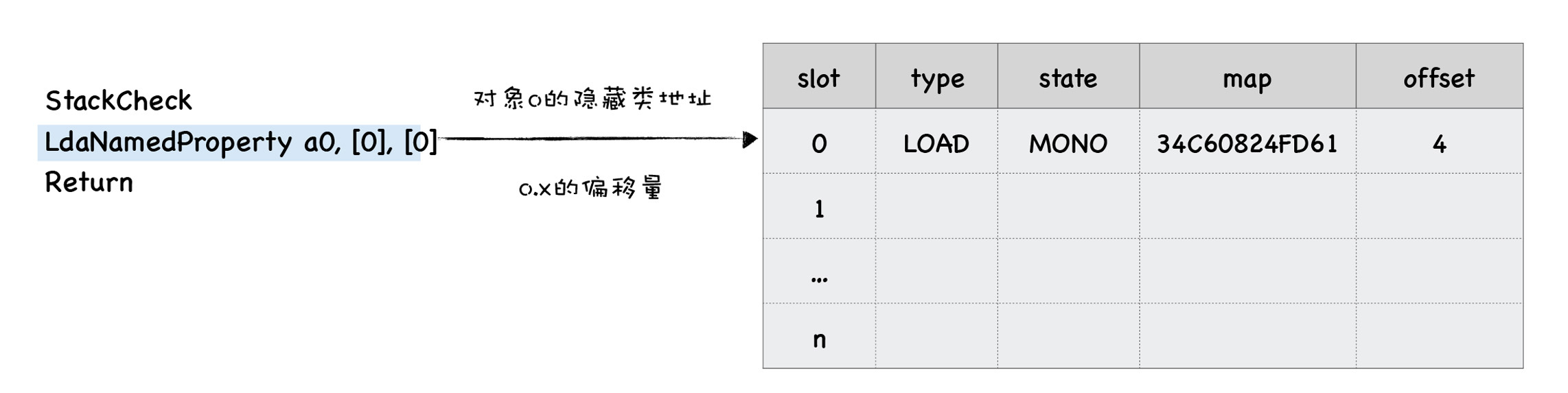 这里我们重点关注LdaNamedProperty这句字节码,我们看到它有三个参数。a0就是loadX的第一个参数;第二个参数[0]表示取出对象a0的第一个属性值,这两个参数很好理解。第三个参数就和反馈向量有关了,它表示将LdaNamedProperty操作的中间数据写入到反馈向量中,方括号中间的0表示写入反馈向量的第一个插槽中。具体你可以参看下图: