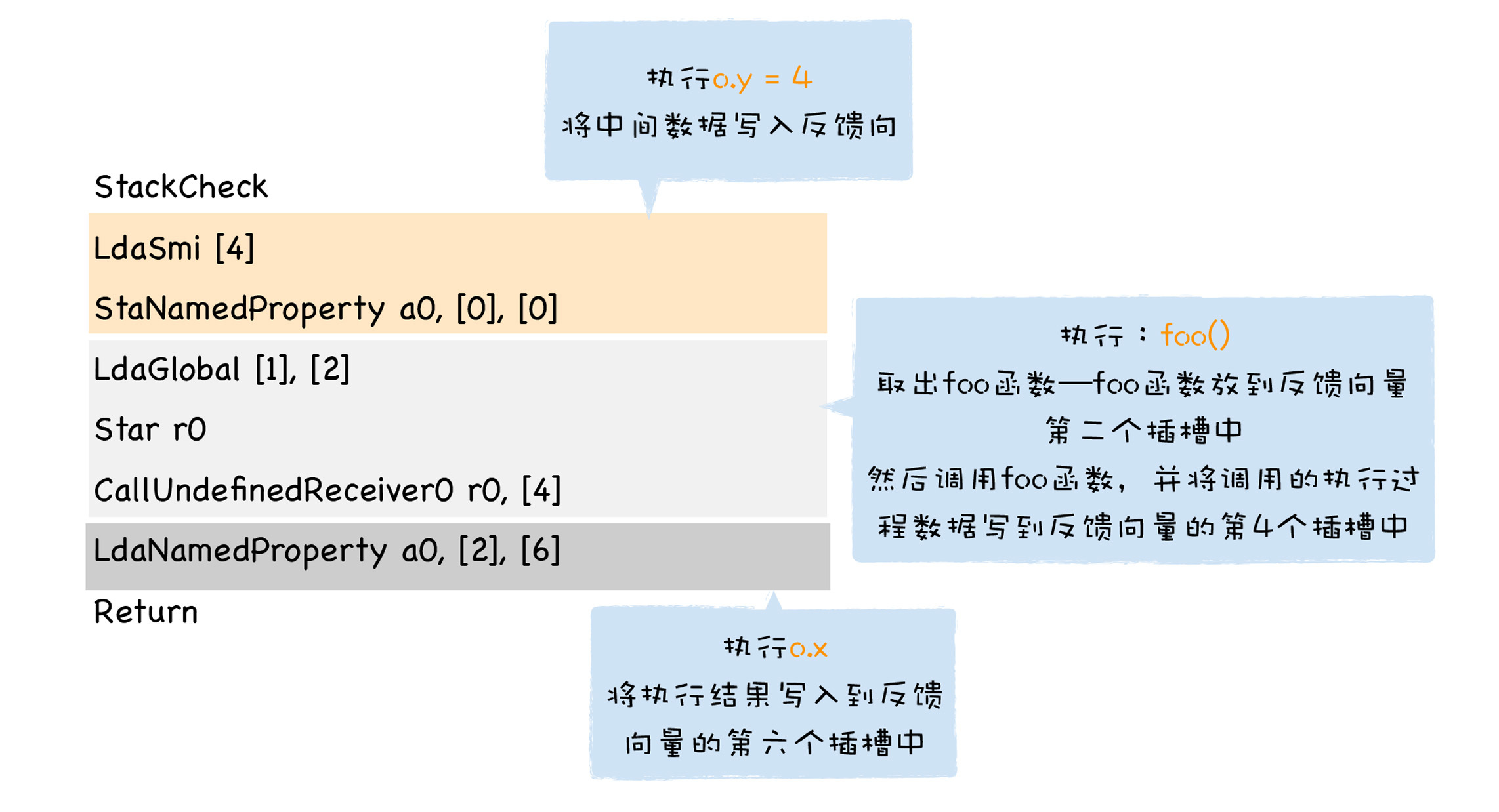 这段代码是先使用LdaSmi [4],将常数4加载到累加器中,然后通过StaNamedProperty的字节码指令,将累加器中的4赋给o.y,这是一个存储(STORE)类型的操作,V8会将操作的中间结果存放到反馈向量中的第一个插槽中。