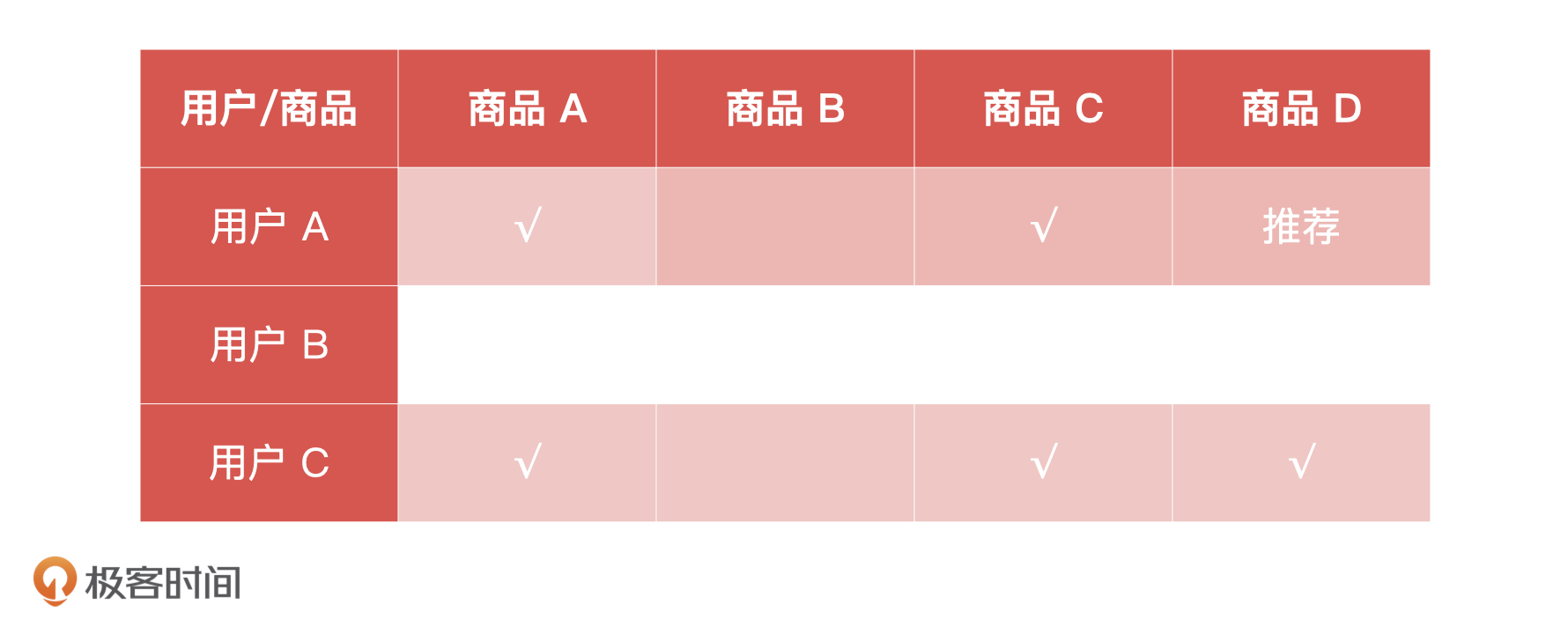 通过这个表格,我们能很直观地看到,用户 A 和用户 C 都喜欢商品 A 和商品 C。由此,我们可以猜测用户 A 和用户 C 的兴趣偏好可能相同。这个时候,我们就可以把商品 D 推荐给用户A。