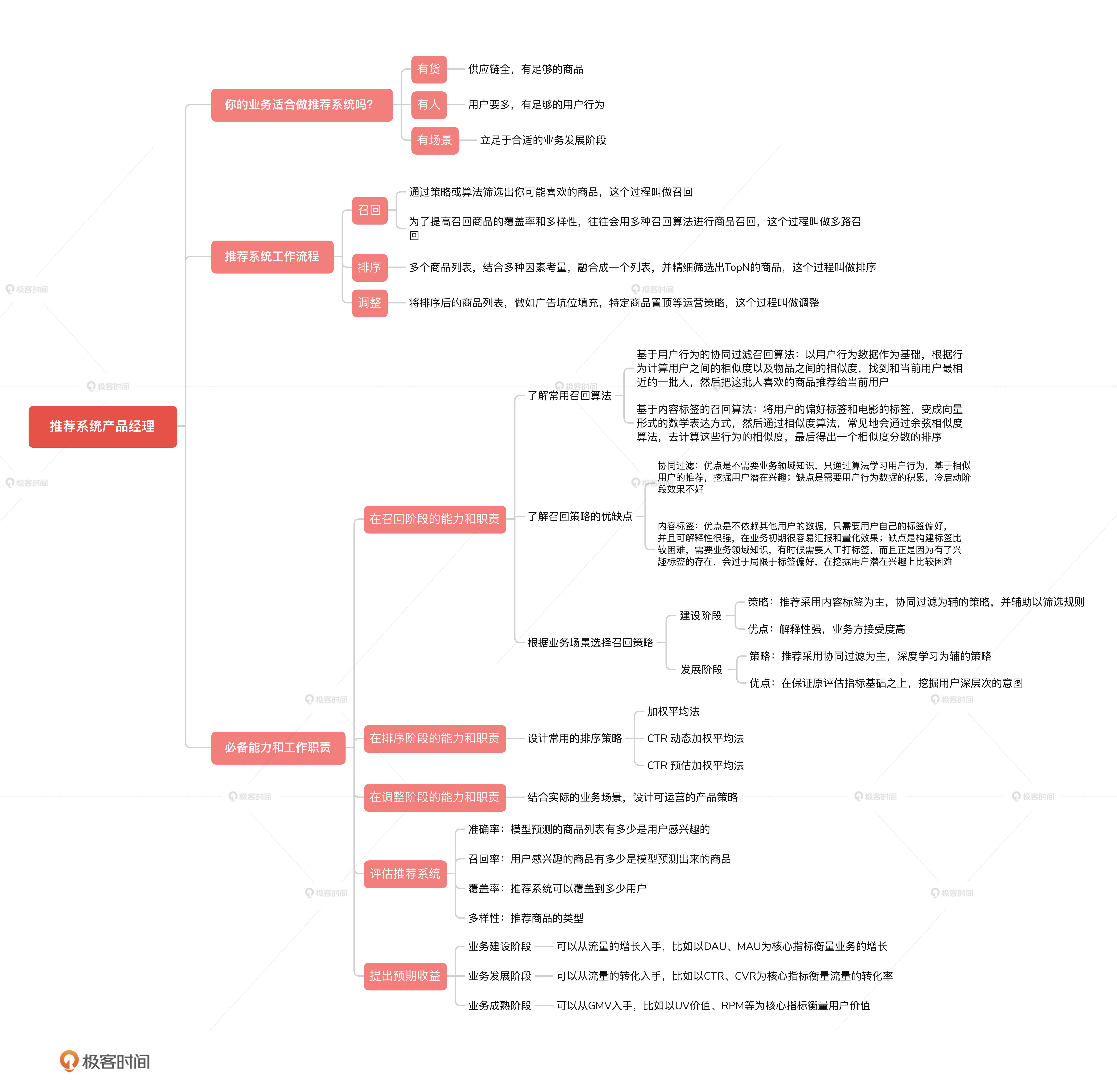 今天,我们讲了推荐系统的工作流程,以及产品经理在推荐系统中需要具备的能力和工作职责。为了帮助你理解和记忆,我总结了一张思维导图,放在了下面。
