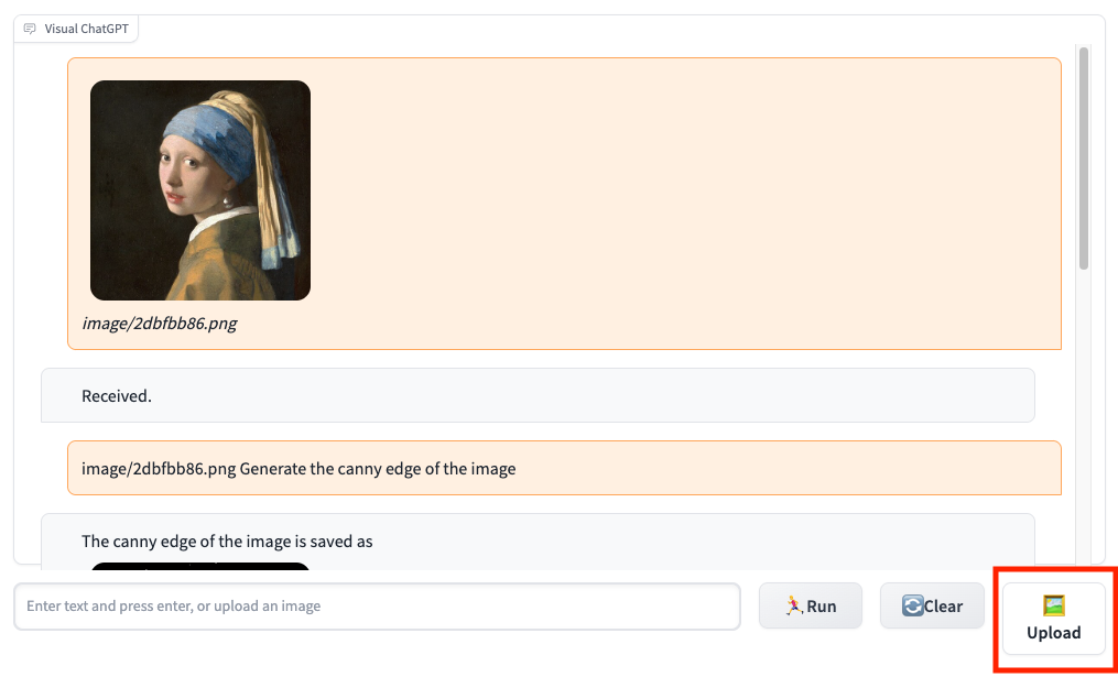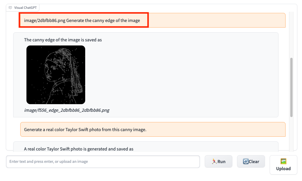 接着,我们在对话框里输入文本 “Generate the canny edge of the image”,Visual ChatGPT就会把上传图片的边缘提取出来,并且生成一张新的图片。