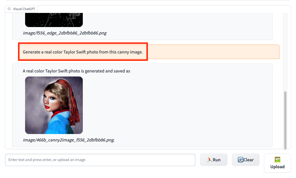 最后,我们在对话框里输入 “Generate a real color Taylor Swift photo from this canny image”,Visual ChatGPT就会基于上面边缘检测的轮廓图生成一个新的人像图。