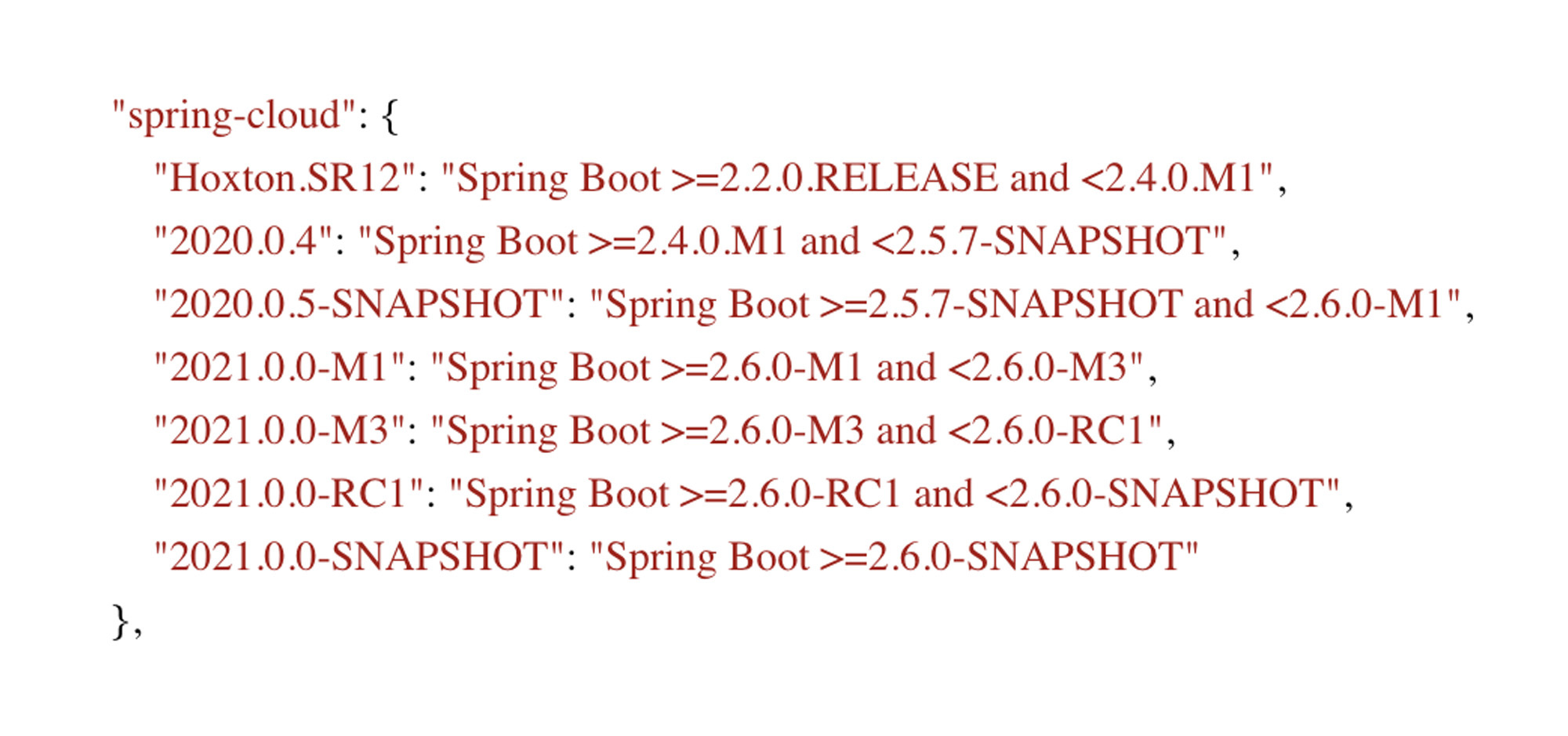 Spring Boot和Spring Cloud的版本匹配关系可以从Spring社区网站获取,访问该网址后你会看到一串JSON文件,在这个文件中,你可以看到Spring 官方给出的Spring Cloud最新分支所支持的Spring Boot版本范围。