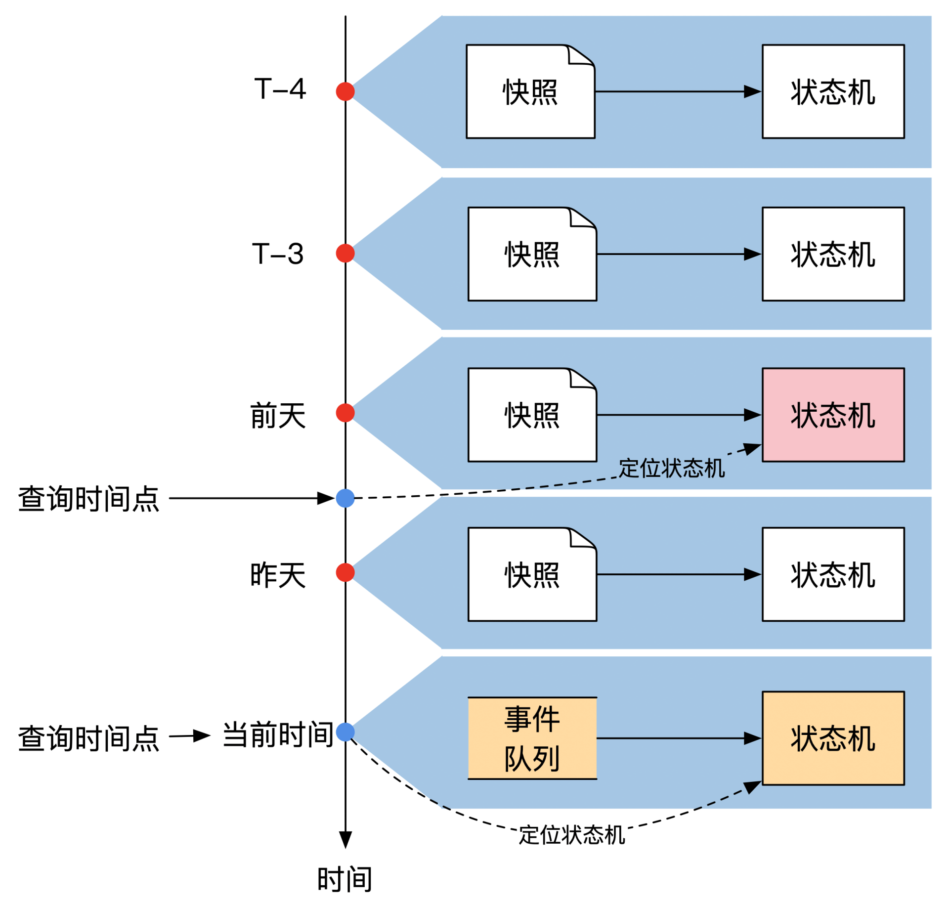 我们再来看看怎么查询历史状态。最直接的方案显然是利用时光机的功能。我们先找到距离查询时间最近的快照,然后从这个快照开始执行事件,直到碰到查询时间点。这时候的状态就是我们需要的状态。一般我们把这个重新计算历史状态的过程叫作回滚。