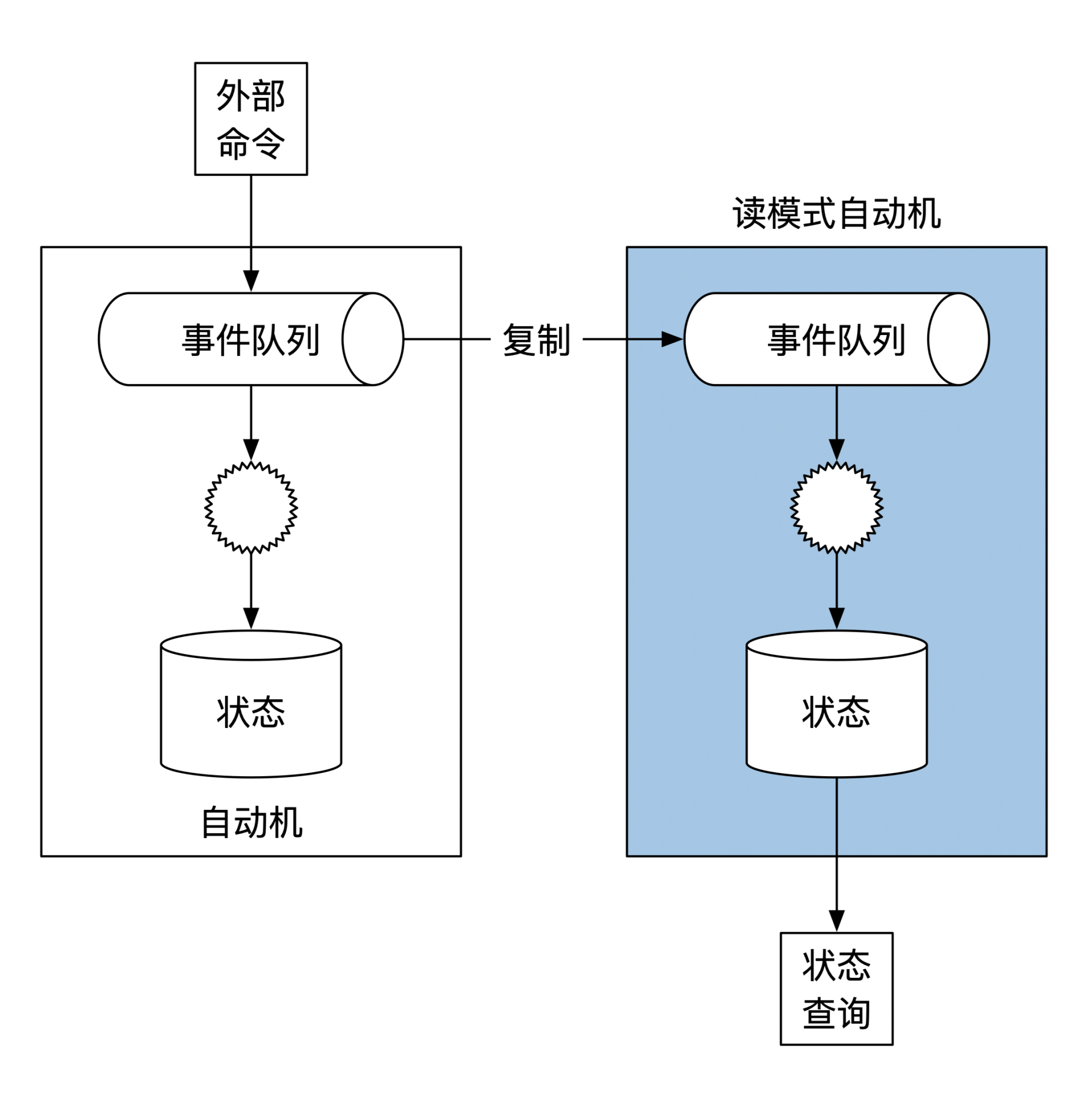思路很简单。如果我们将事件队列实时地复制出来,然后在另一台机器上用自动机执行这些事件,那么我们不就有最新的状态了吗?这就是状态机的读模式(Read Mode)。在读模式下,状态机只负责执行事件,不负责处理命令。示意图如下: