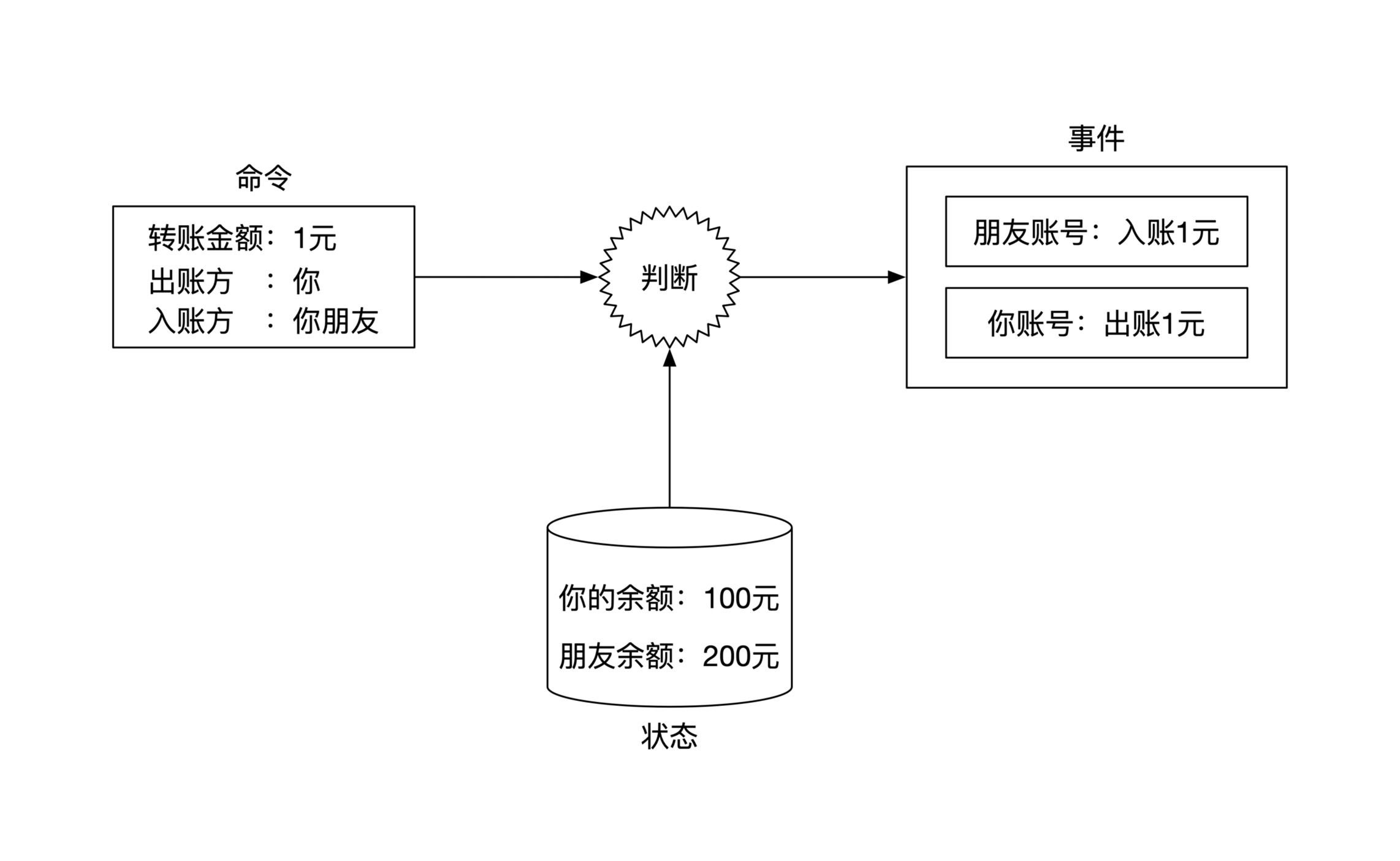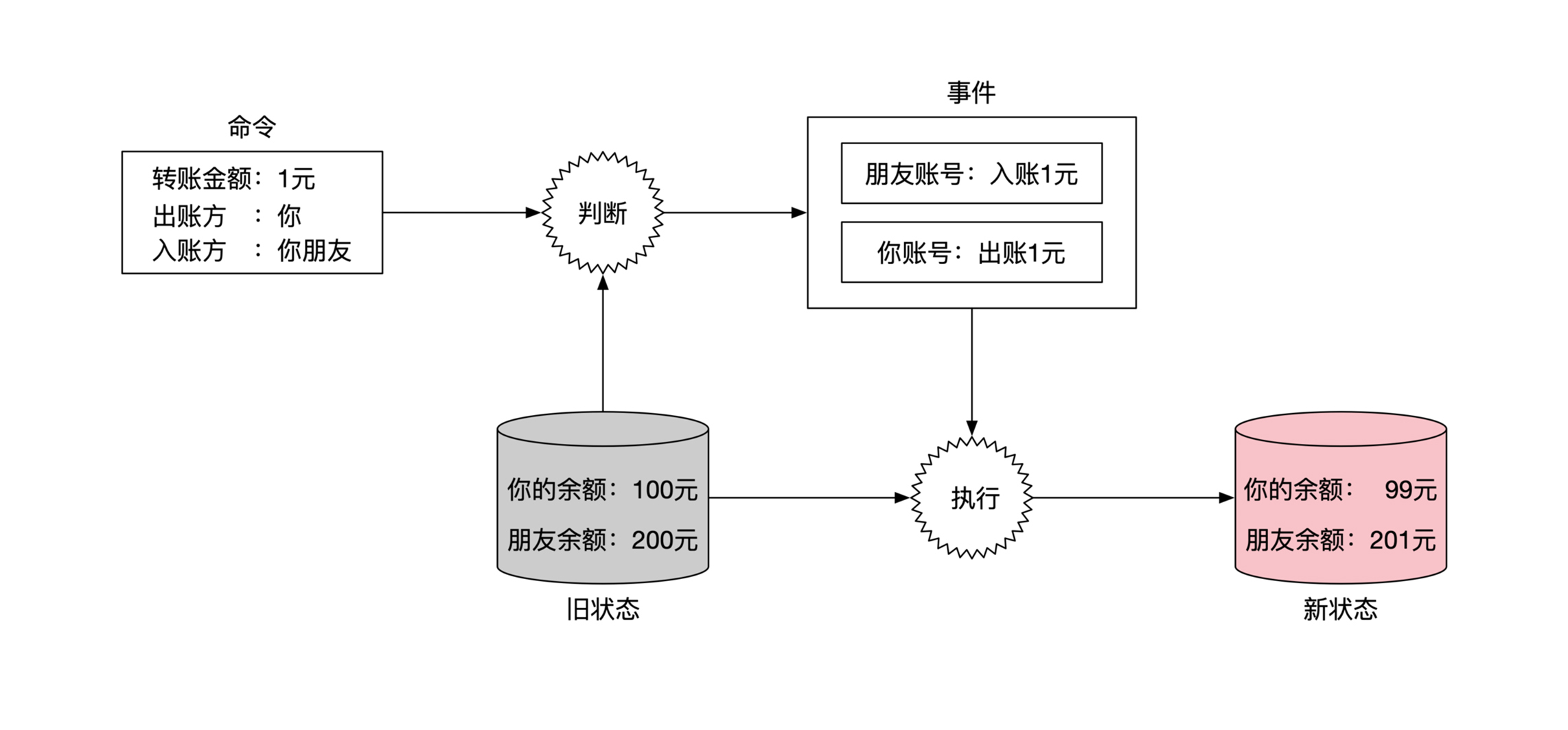 假设你想通过手机转账的方式,转给你的朋友一块钱。这个转账请求是命令,会发送到账务系统。
