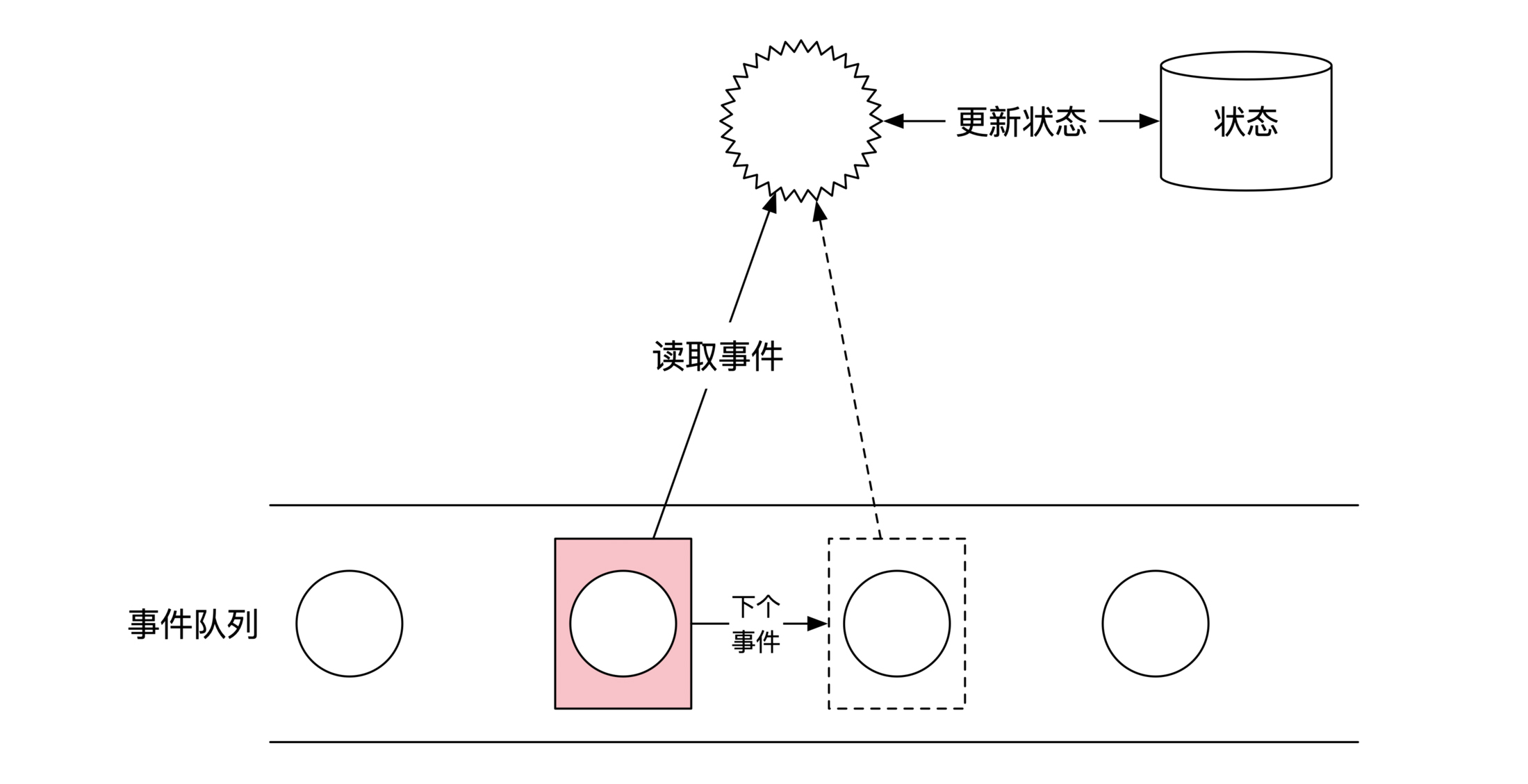 事件的执行用到了计算机里最经典的计算模型,叫作自动机。你可以将事件队列当作一个有始无终的磁带。你会从头开始依次读取每个事件。读取之后按事件内的指示来改变内存状态。然后挪到下一个位置,继续处理下一个事件。是不是很简单?自动机的示意图如下: