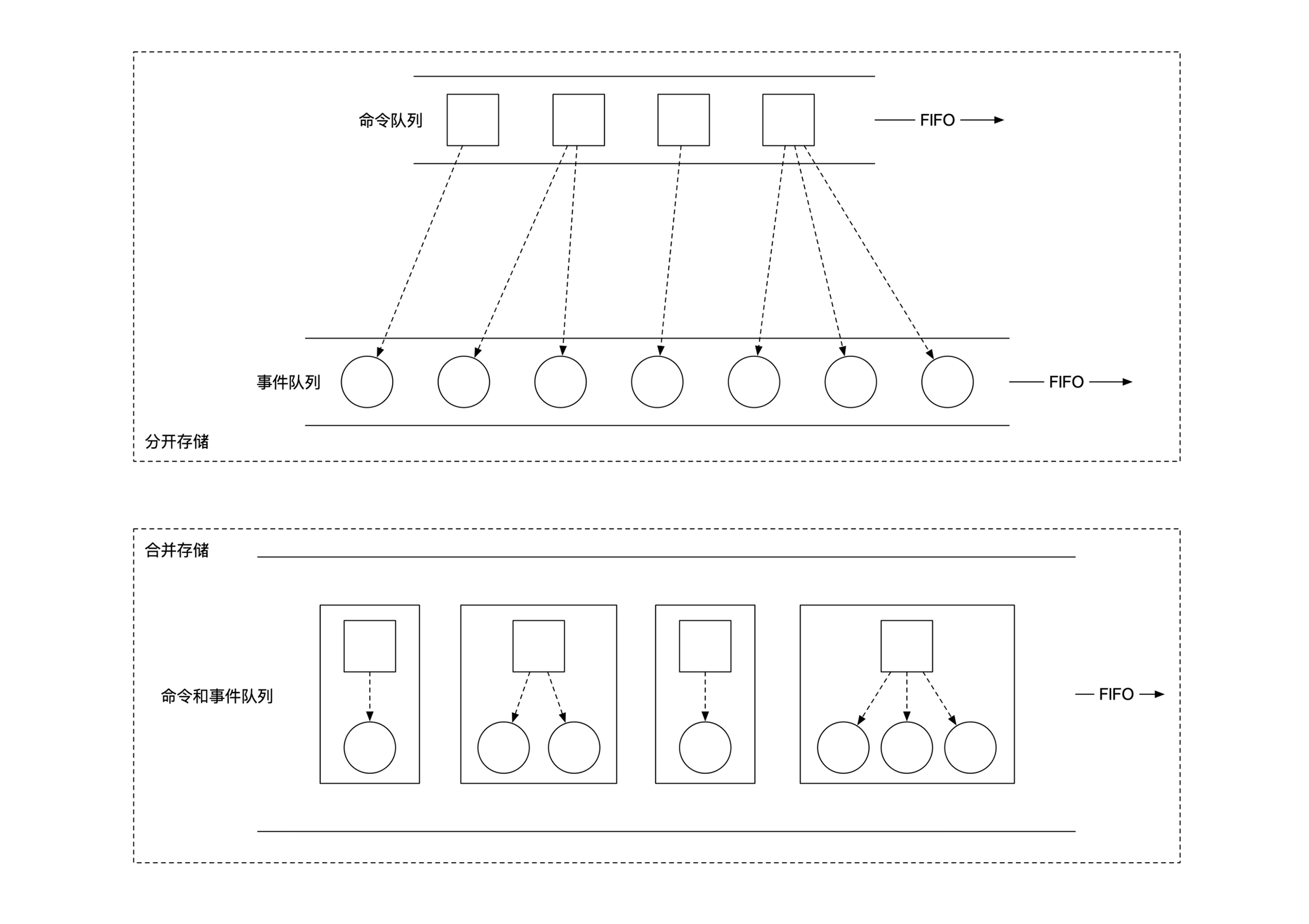 保证顺序的方法也不难,就是将所有的命令和事件都分别放到两个先入先出的队列(First In,First Out,FIFO)。一般这些队列会被保存到文件中。系统会从命令队列中逐一读取下一个命令,判断这个命令是否合理,然后将生成的所有事件放到事件队列末尾。示意图如下: