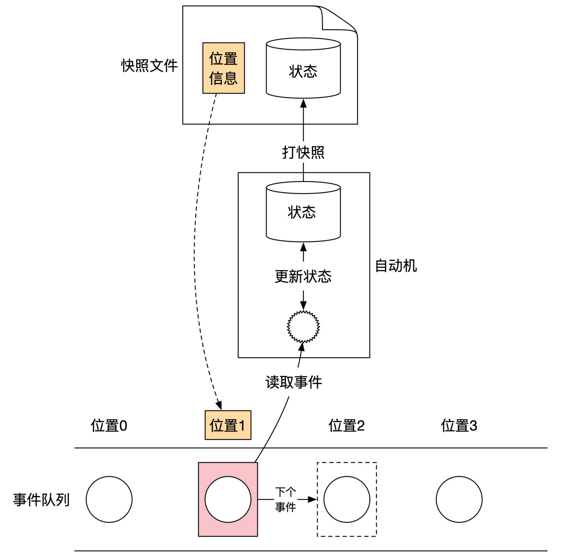 优化的方法很简单,只要将当前的系统状态全都保存到文件就可以了。我们一般称呼这个过程为打快照(Snapshot)。过了一段时间之后,如果想要恢复到系统的最新状态,你只需要先将快照文件加载到自动机里,然后从打快照的时间点开始执行后面的事件。
