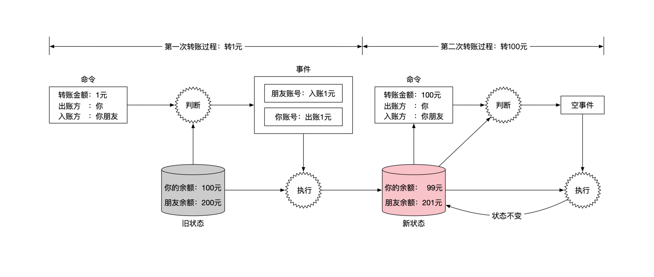 **当命令的检查不通过时,系统可以选择不生成事件,或者选择生成一个空事件(NOP)。**生成空事件的好处是能在系统中记录某个命令在历史上曾经存在过。空事件的执行结果是不改变任何状态。这里你这两次转钱的流程示意图如下: