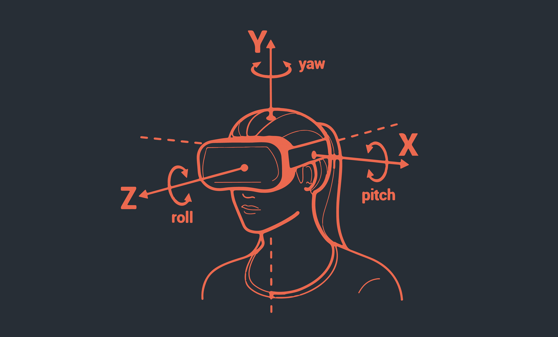 我们先来看VR的交互,VR一般需要沉浸式的头戴设备。为了保持视觉体验的自然性,需要时时刻刻地跟踪头部运动,所有虚拟环境的渲染和声音效果都要跟随头部运动,才能保证其沉浸感。这样的头部跟踪体现在3D空间中,无非就是围绕X轴、Y轴和Z轴的旋转以及它们的组合。