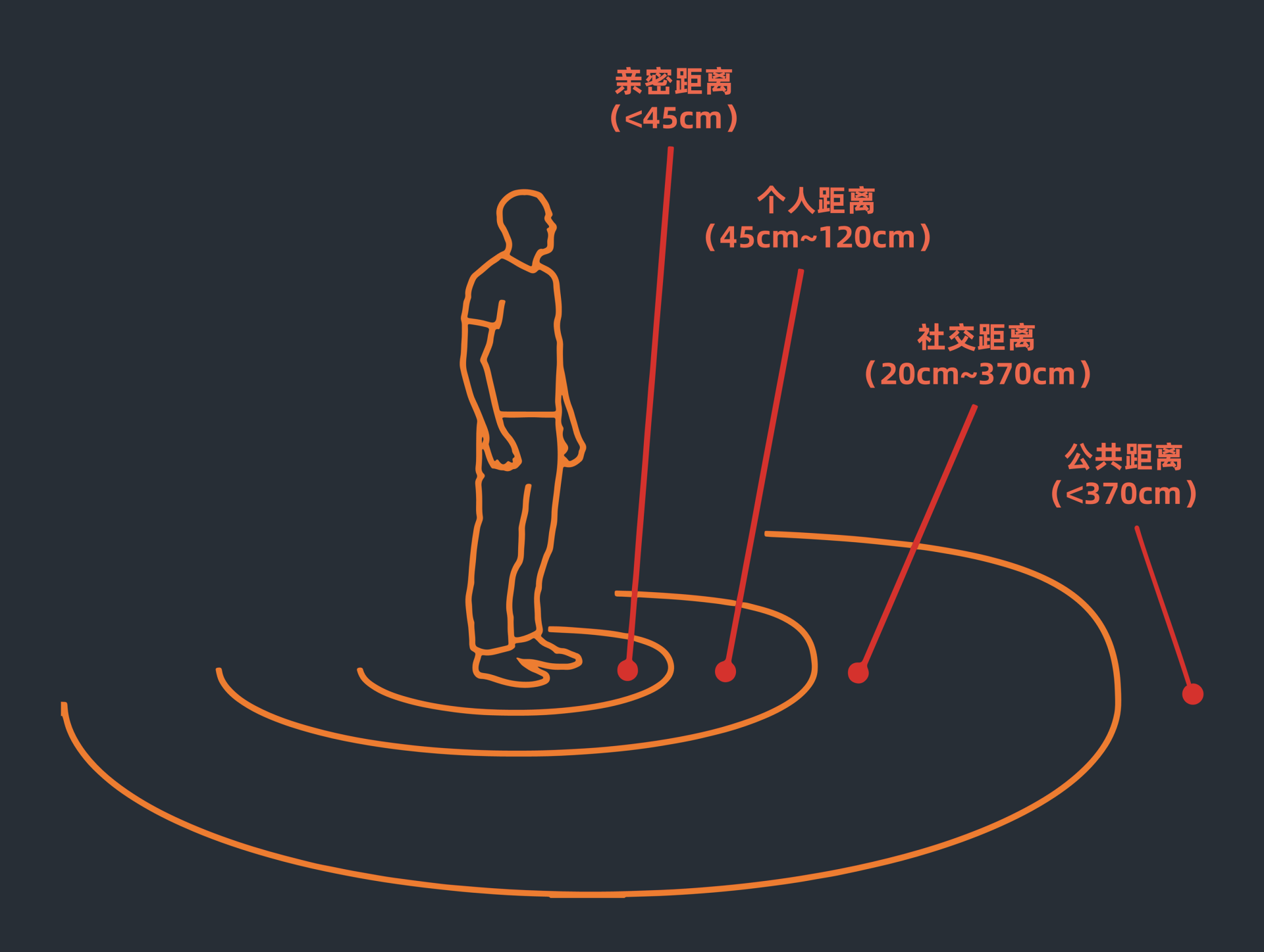 距离对于人们的感知至为重要,因此我们的虚拟元素应避免放在亲密距离之内。如果你希望让用户能清楚看到对象,并易于与之进行互动,放置在个人距离会比较合适。如果是多人互动中的虚拟元素,要默认放在社交距离内,这会让所有人都觉得舒服。同时,在公共空间内放置的虚拟元素必须要简单、清晰且易于识别。
