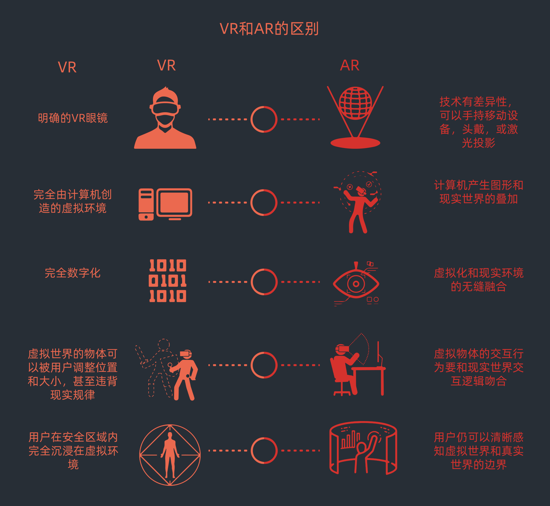 这两者的区别在于VR的周围环境是完全虚拟的,而AR的周围环境有一部分是真实的,AR在真实环境中叠加了虚拟对象层。这个差异性也导致了两者设计上会有很大的不同,你可以先通过下图了解一下。