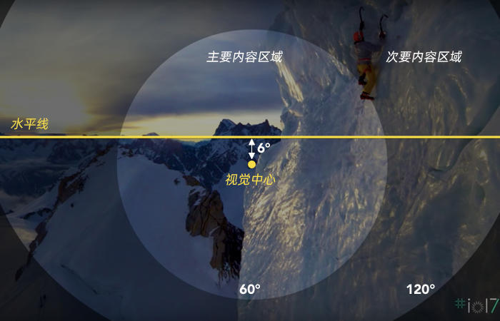 其次,关键交互元素不要严格在水平线上下对称。我们知道,一般情况下人的视觉焦点会在水平线下6度左右的位置,这个关于上下左右交互角度的考虑,我们在前面的[04]课中有提及,你可以回去再复习一下。虽然我们设计空间交互的主页面,是一个横向154度的广阔空间,但是让用户聚焦的操作区域,要注意不能超出横向60度,纵向32度的舒适区范围。