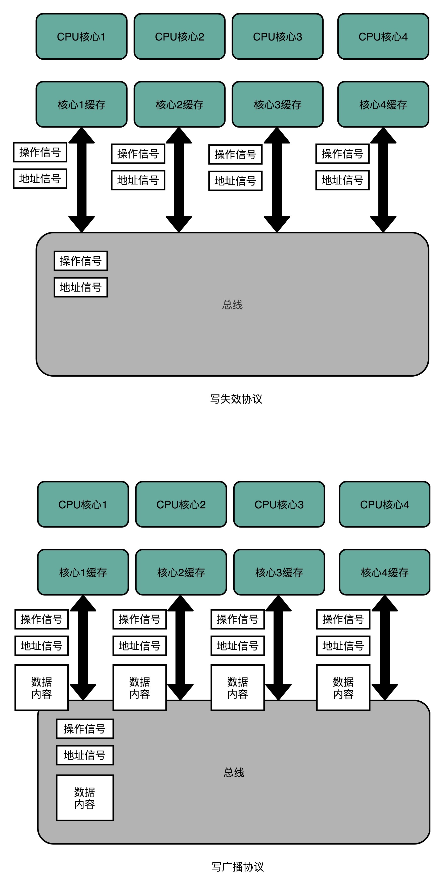 写广播在实现上自然很简单,但是写广播需要占用更多的总线带宽。写失效只需要告诉其他的CPU核心,哪一个内存地址的缓存失效了,但是写广播还需要把对应的数据传输给其他CPU核心。