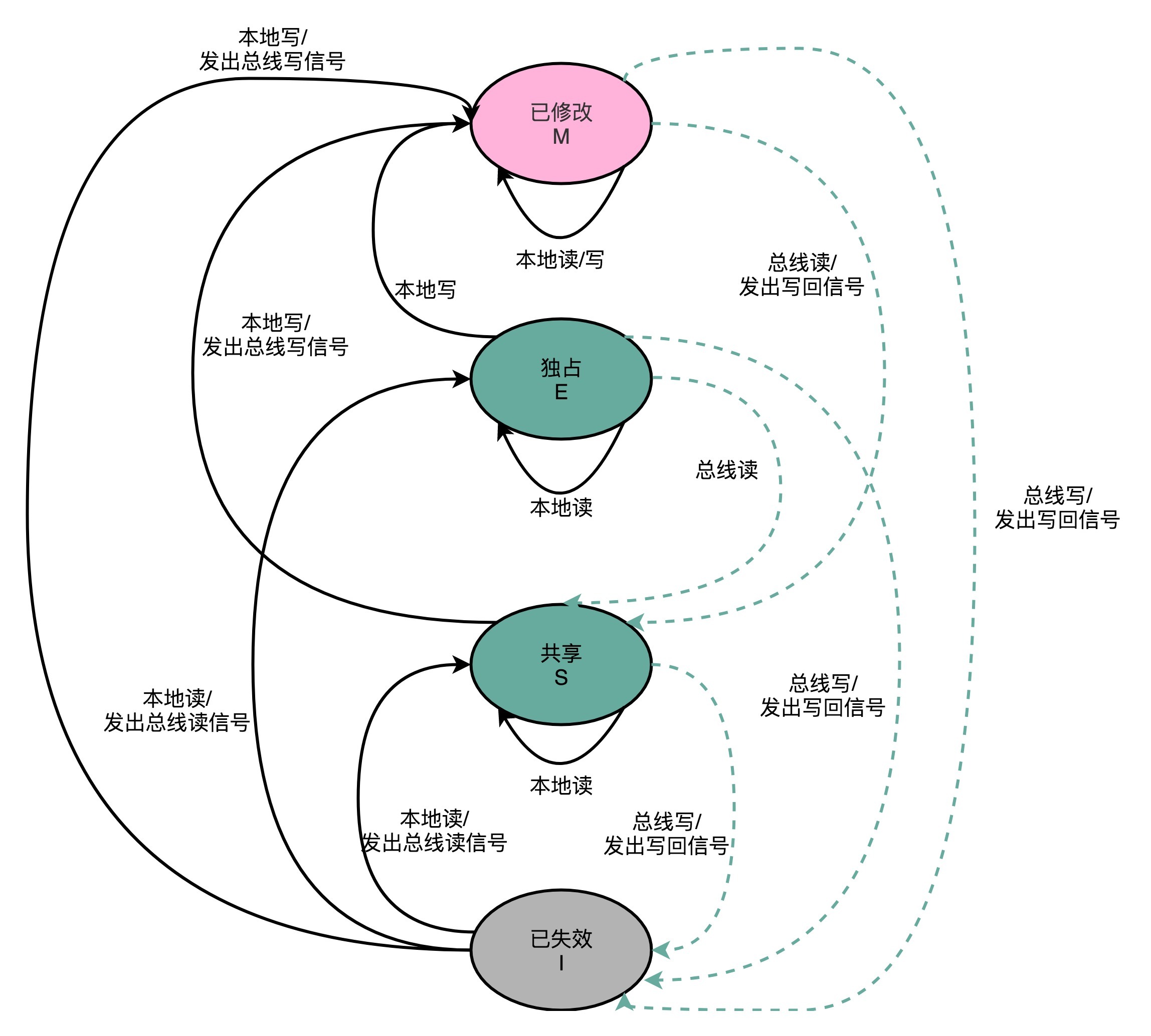 我们先来看看“已修改”和“已失效”,这两个状态比较容易理解。所谓的“已修改”,就是我们上一讲所说的“脏”的Cache Block。Cache Block里面的内容我们已经更新过了,但是还没有写回到主内存里面。而所谓的“已失效“,自然是这个Cache Block里面的数据已经失效了,我们不可以相信这个Cache Block里面的数据。