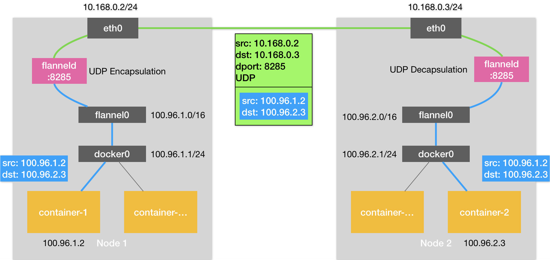 当然,这个请求得以完成的原因是,每台宿主机上的flanneld,都监听着一个8285端口,所以flanneld只要把UDP包发往Node 2的8285端口即可。