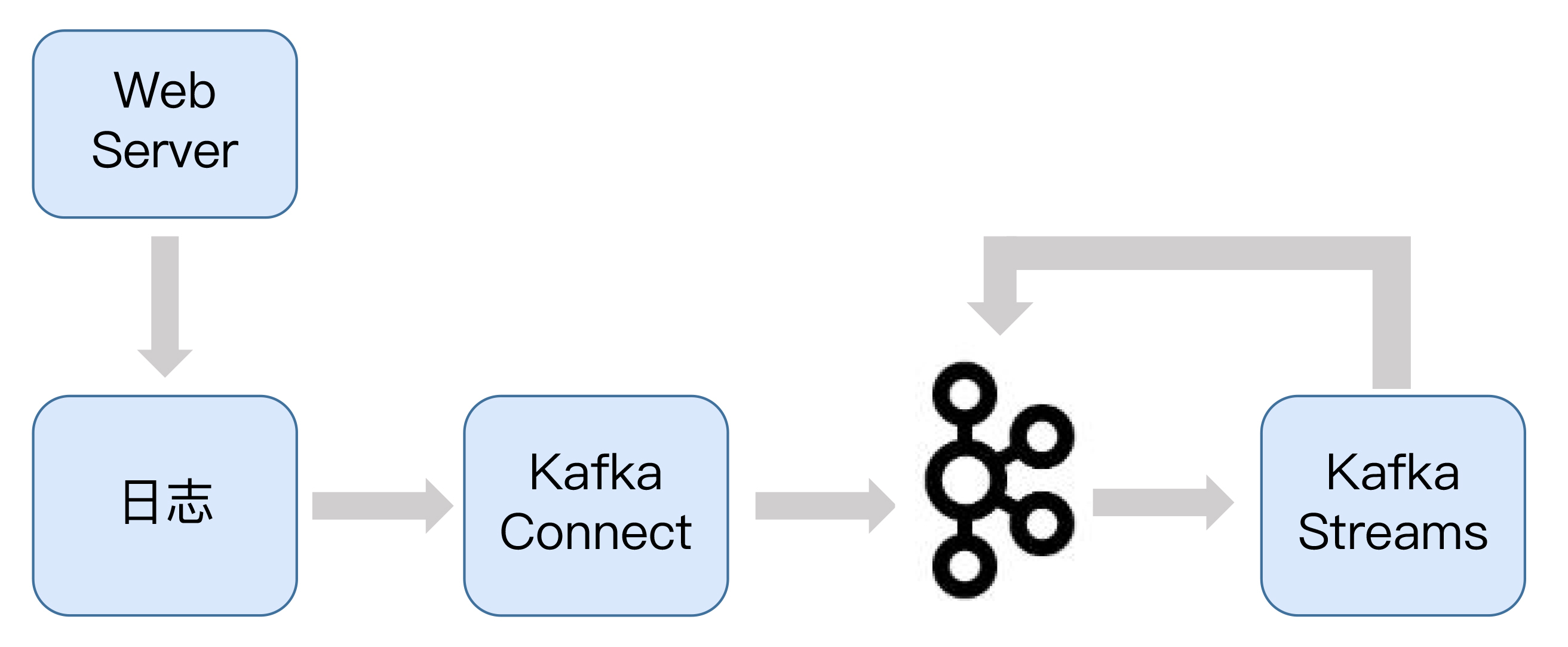 从图中我们可以看到,日志先从Web服务器被不断地生产出来,随后被实时送入到Kafka Connect组件,Kafka Connect组件对日志进行处理后,将其灌入Kafka的某个主题上,接着发送到Kafka Streams组件,进行实时分析。最后,Kafka Streams将分析结果发送到Kafka的另一个主题上。