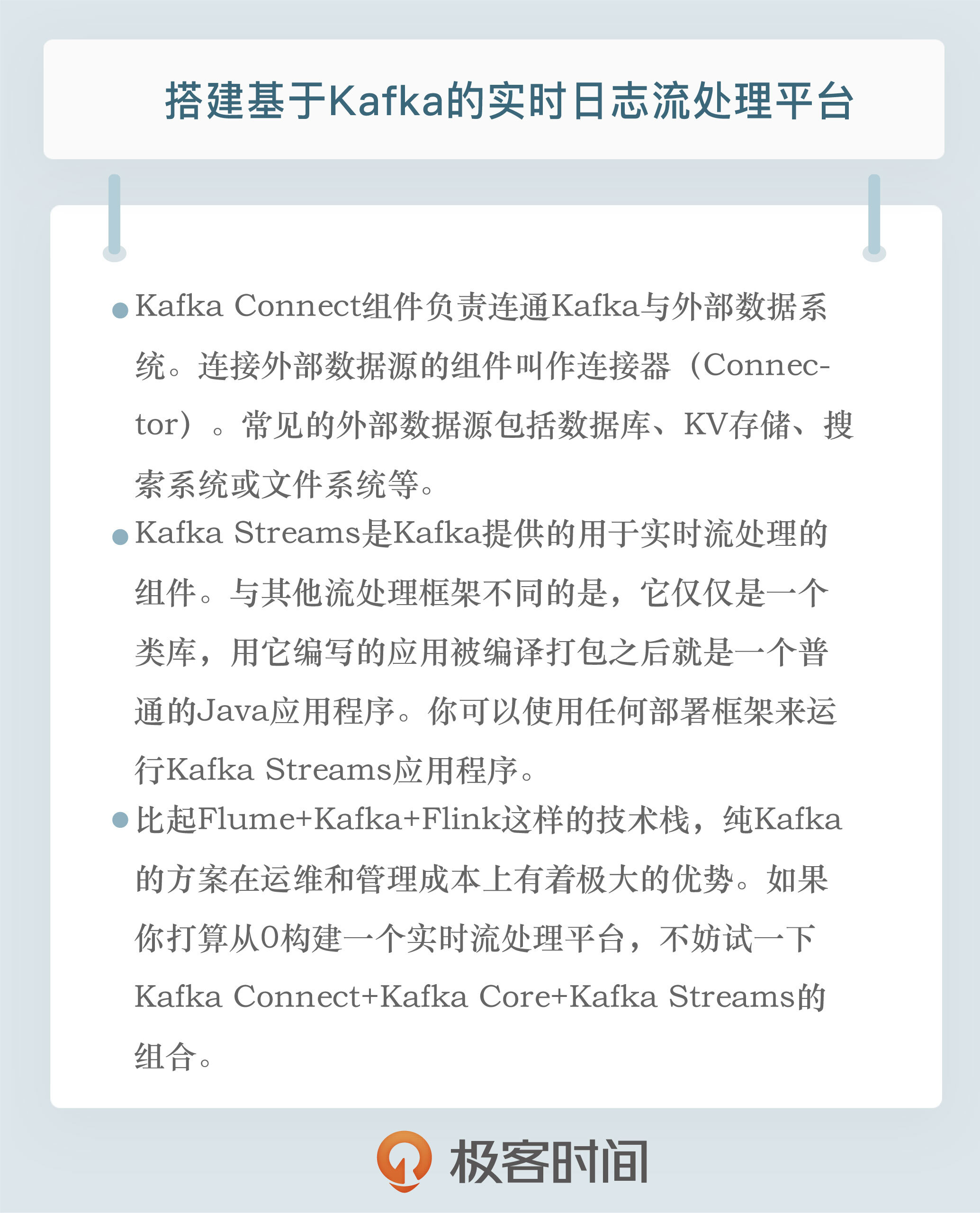 我在专栏前面简单介绍过Kafka Connect和Kafka Streams组件,前者可以实现外部系统与Kafka之间的数据交互,而后者可以实时处理Kafka主题中的消息。