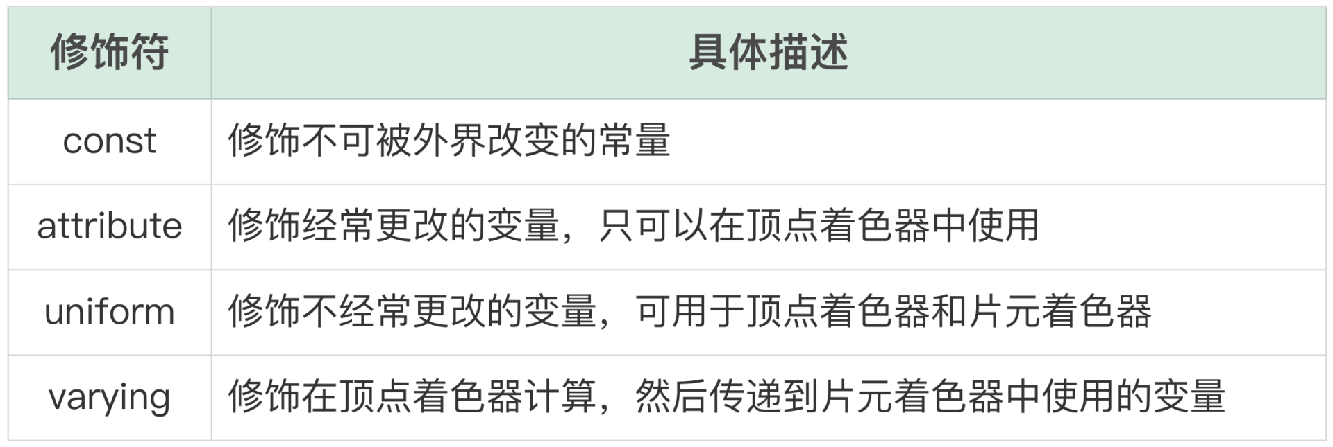 其实GLSL的语法跟C语言非常类似,所以我们学起来也会比较轻松。我们先来看一下GLSL中变量的修饰符,具体如下:
