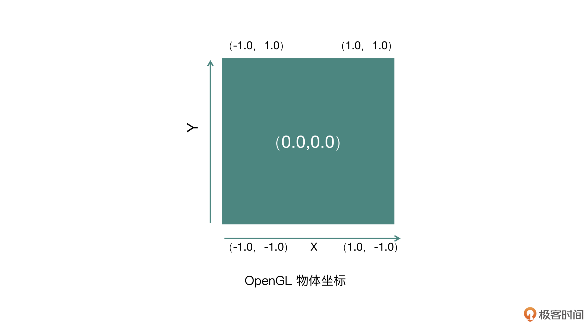 如图所示,OpenGL规定物体坐标系中X轴从左到右是从-1到1变化的,Y轴从下到上是从-1到1变化的,物体的中心点是(0, 0)的位置。