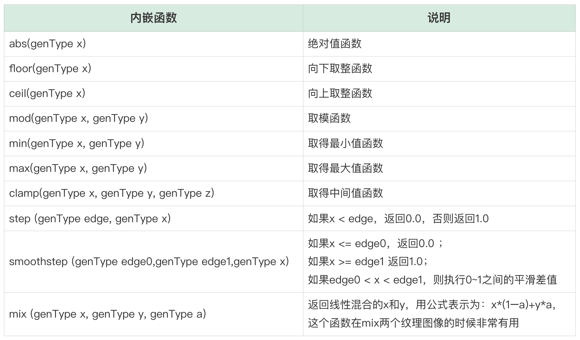 然后是GLSL内嵌函数部分,我们在这里只介绍常用的几个常用函数。