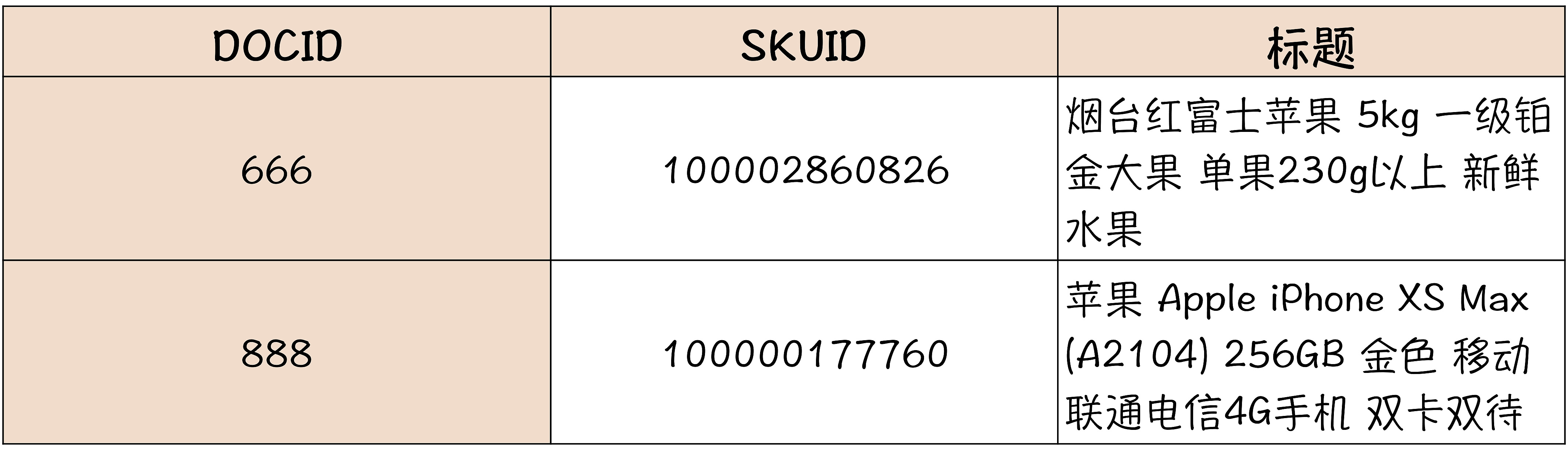 可以看到,这个倒排索引的表,它是以单词作为索引的Key,然后每个单词的倒排索引的值是一个列表,这个列表的元素就是含有这个单词的商品记录的DOCID。