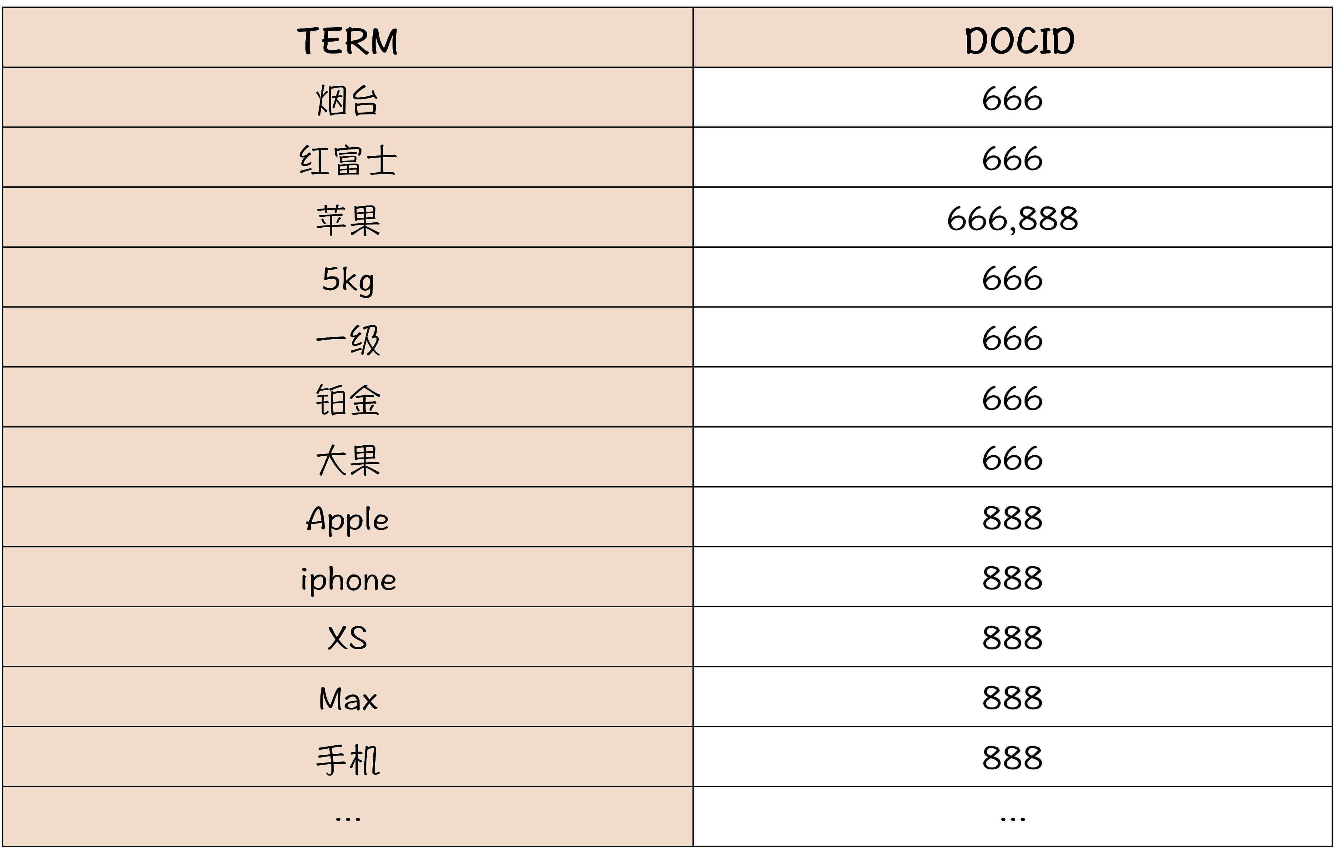 为了能够支持快速地全文搜索,ES中对于文本采用了一种特殊的索引:倒排索引(Inverted Index)。那我们看一下在ES中,这两条商品数据倒排索引长什么样?请看下面这个表。