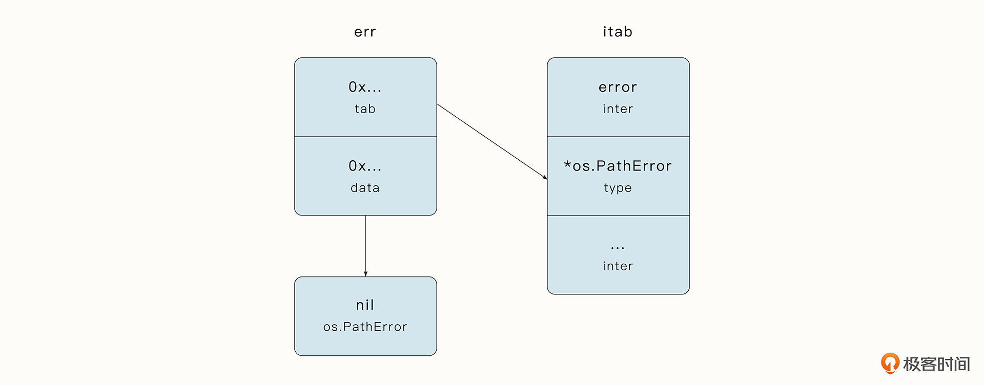 这是因为当接口为nil时,代表接口中的动态类型和动态类型值都为nil,而当前由于接口error具有动态类型*os.PathError,接口的内部结构体itab不为空。如下图所示: