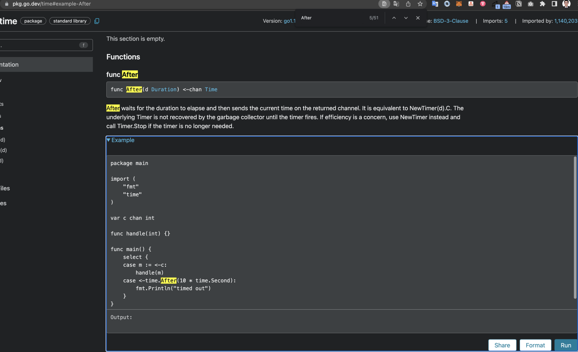 这里我模拟鼠标点击事件,给你做一个演示。假设我们访问Go time 包的说明文档,例如After函数,会发现下图的参考代码是折叠的。
