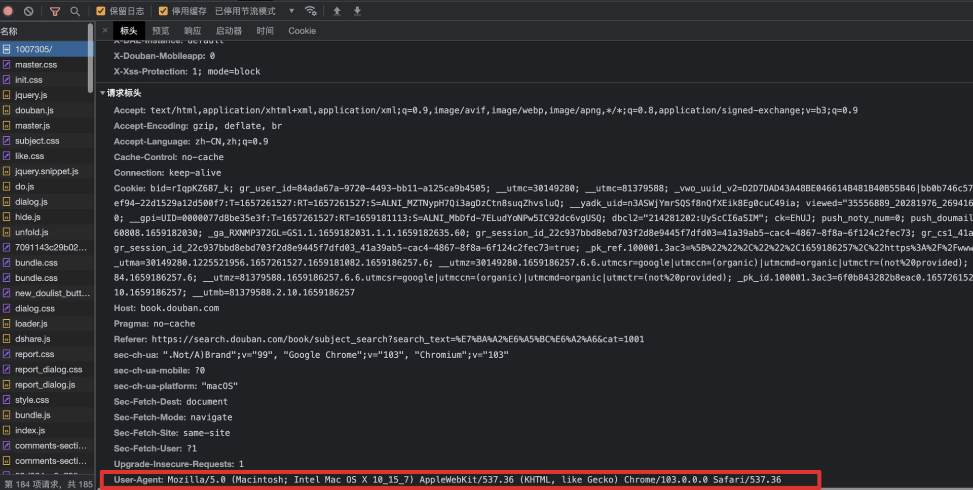 显然,豆瓣现在有一些反爬机制阻止了我们对服务器的访问。如果我们使用浏览器的开发者工具(一般在windows下为F12快捷键),或者通过wireshark等抓包工具查看数据包,会看到浏览器自动在HTTP Header中设置了很多内容,其中比较重要的一个就是User-Agent字段,它可以表明当前正在使用的应用程序、设备类型和操作系统的类型与版本。