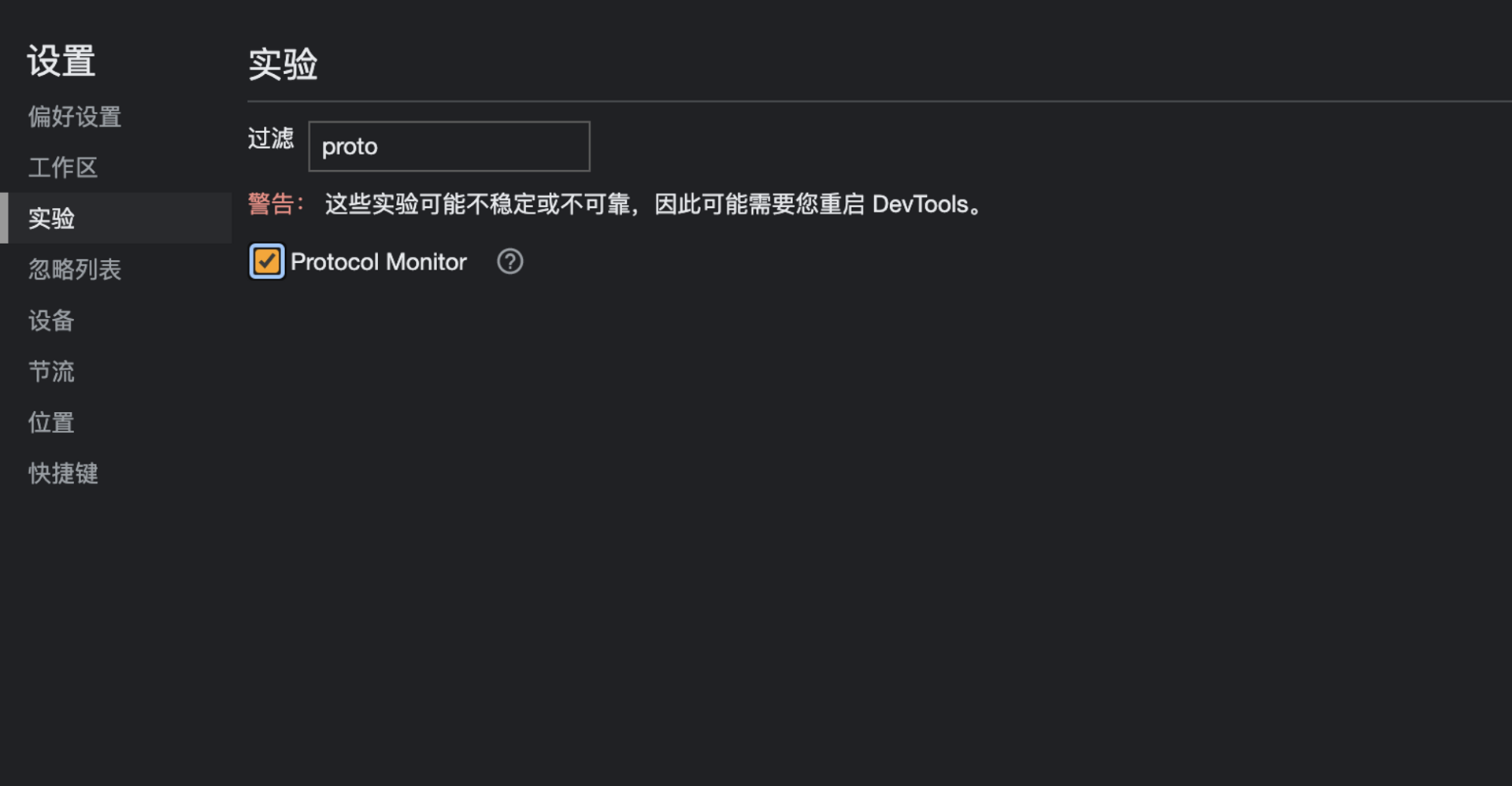 查看谷歌开发者工具与浏览器交互的协议的方式是,打开谷歌浏览器,在开发者工具 →设置→ 实验中勾选 Protocol Monitor(协议监视器)。