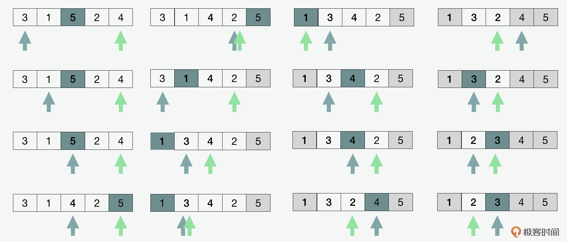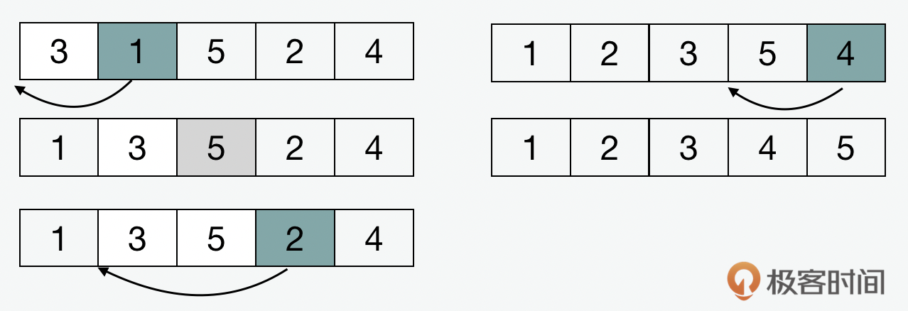 首先,我们先来看看理论类的冒泡、选择这两种排序算法。这两种方式用的都是一种比较和交换的方法(compare and swap)。我们上面说过,对于数组来说,如果我们在非队尾的位置插入的话,就容易造成队列中插入的元素以后的一系列元素的移动。但是如果使用交换的方式,就巧妙地避免了这个问题。
