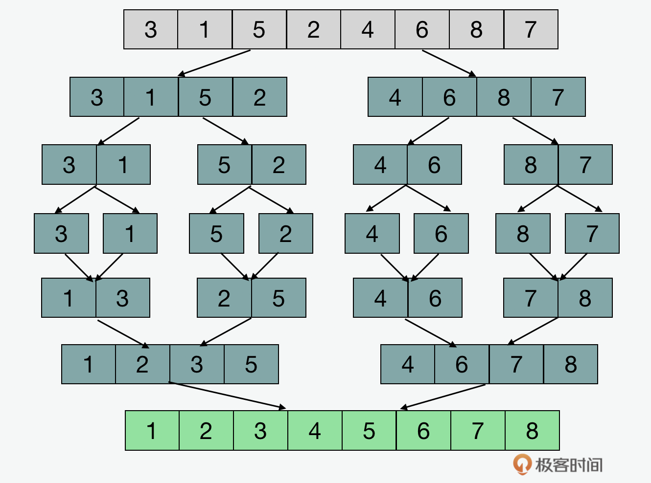 归并排序(merge sort)可以算是比较常见的应用型排序算法了,它的复杂度是$O(n log n)$。下面,我们就来看看它的实现。归并算法用到的是我们前面介绍过的递归和分治的算法思想。这种方法的核心就是先把一个大的数组拆分成只包含一个元素的不可再分的数组,然后两两比较,最后再合并成一个数组。