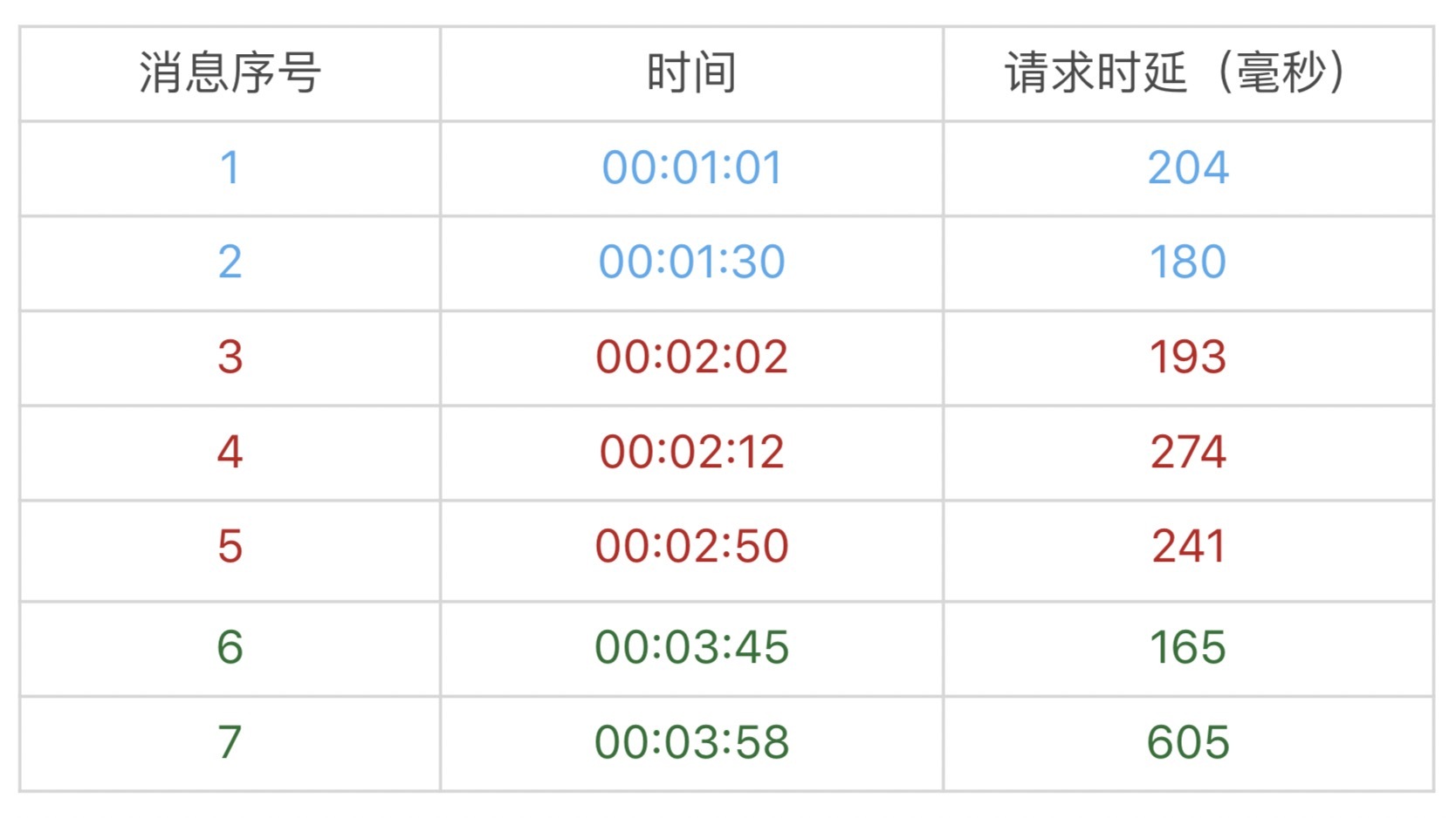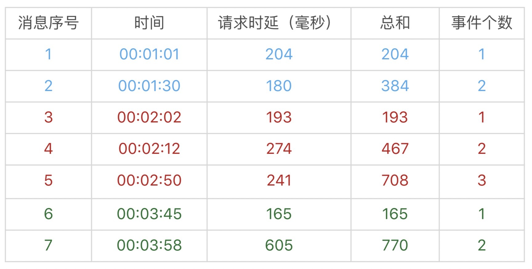 从业务需求上看,有边界数据与无边界数据的计算目的是完全不同的。比如对于分布式监控系统,我们需要基于IP地址、用户帐号、请求类型等许多特征进行定时的聚合统计,例如获取每分钟内所有请求处理时延的平均值、中位数、最大值等,监控系统性能。此时,可以根据请求执行结果的产生时间对数据进行分片计算。比如,下表中有7条监控数据,需要求出每分钟请求时延的平均值。