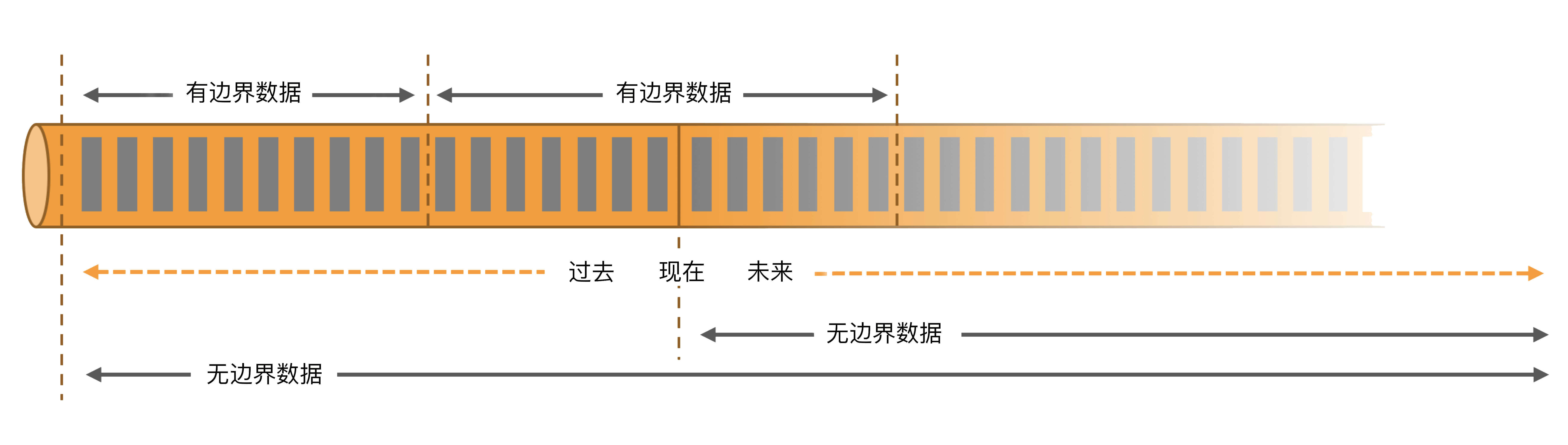 在数据库、HDFS等分布式系统中存放的静态数据,由于拥有清晰的边界,所以被称为InBound Data有边界数据。然而,线上运行中的互联网产品生命周期并不确定,它产生的数据有明确的开始,却没有截止时间点。对于这样有始无终的实时数据流,我们把它称为OutBound Data无边界数据,如下图所示: