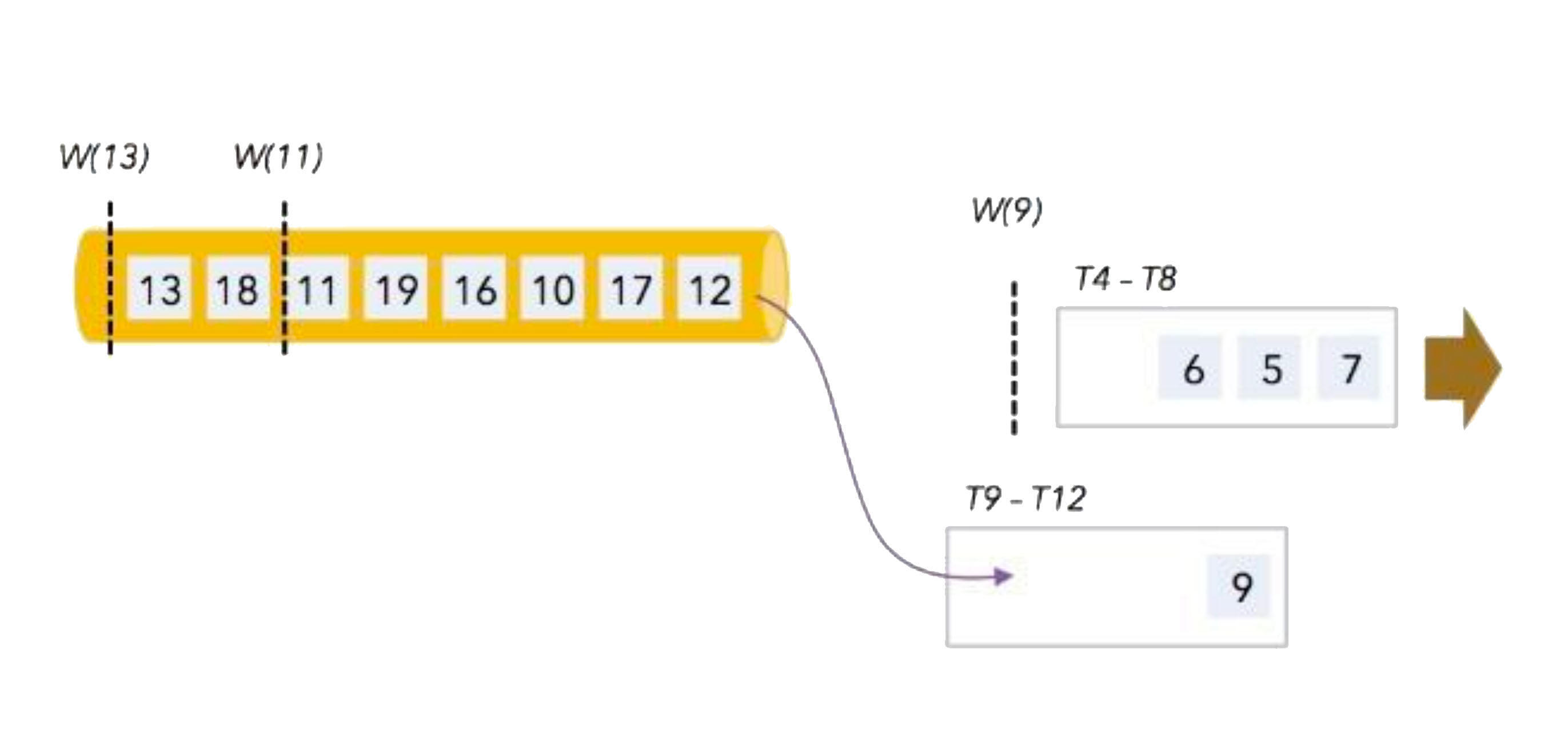 当然,并不是有了水位线,第1个窗口就会无限制的等下去。在经历一个时间段后,第1个窗口会认定窗口关闭(这未必准确),它会处理3、1、3、2这4个事件。基于业务规则,下一个水位被设置为9: