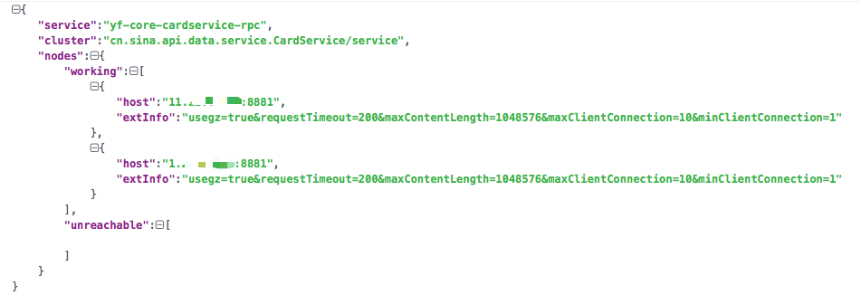 所以注册中心存储的服务信息一般包含三部分内容:分组、服务名以及节点信息,节点信息又包括节点地址和节点其他信息。从注册中心中获取的信息结构大致如下图所示。