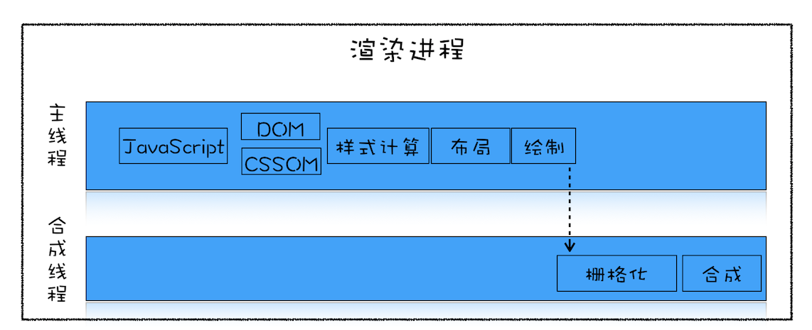 还有另外一种情况,通过CSS实现一些变形、渐变、动画等特效,这是由CSS触发的,并且是在合成线程上执行的,这个过程称为合成。因为它不会触发重排或者重绘,而且合成操作本身的速度就非常快,所以执行合成是效率最高的方式。