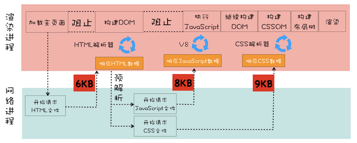 通过前面文章的讲解,你应该已经知道了并非所有的资源都会阻塞页面的首次绘制,比如图片、音频、视频等文件就不会阻塞页面的首次渲染;而JavaScript、首次请求的HTML资源文件、CSS文件是会阻塞首次渲染的,因为在构建DOM的过程中需要HTML和JavaScript文件,在构造渲染树的过程中需要用到CSS文件。