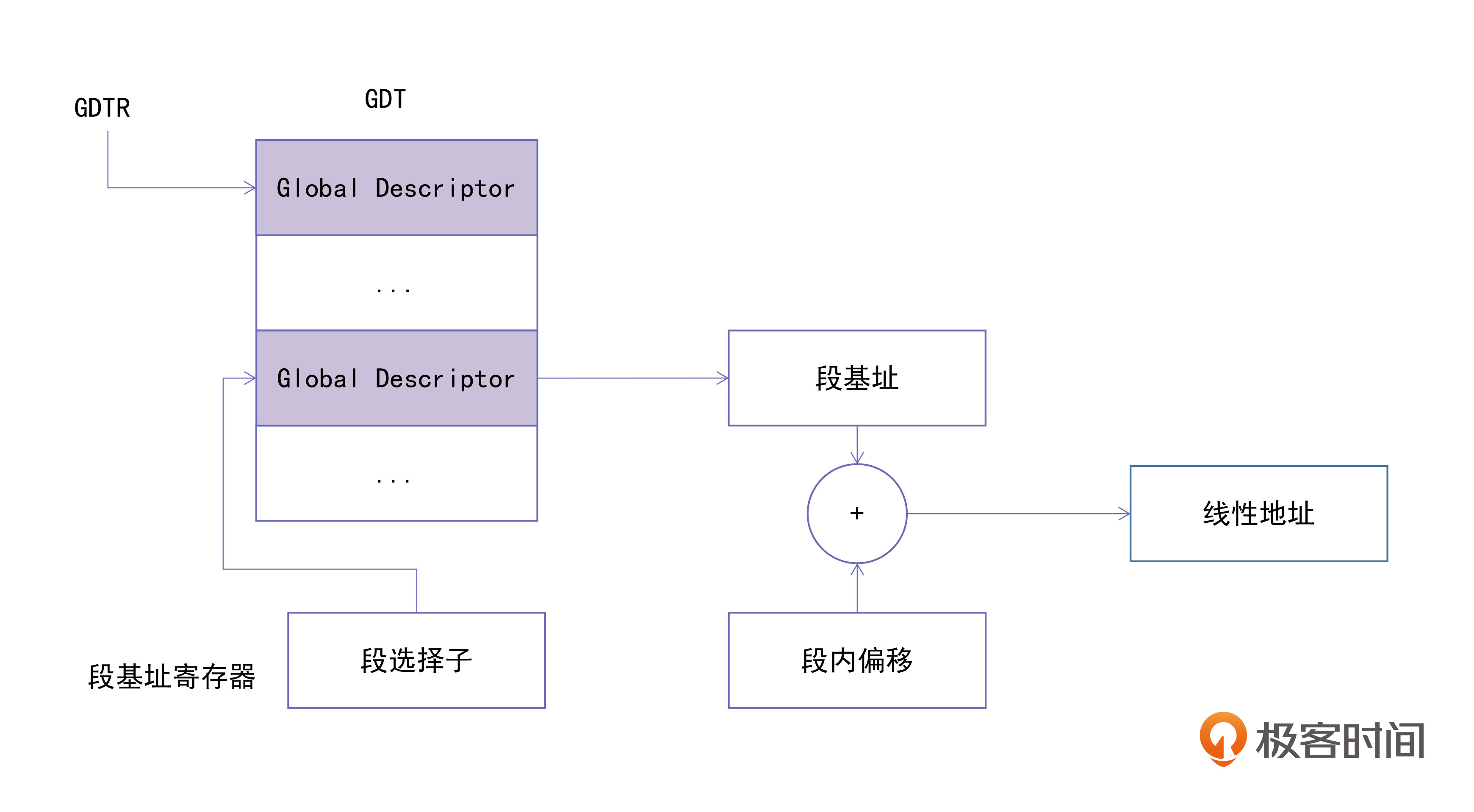 在上面这张图中,CPU在处理一个逻辑地址“cs:offset”的时候,就会将GDTR中的基址加上cs中的下标值来得到一个段描述符,再从这个段描述符中取出段基址,最后将段基址与偏移值相加,这样就可以得到线性地址了。这个线性地址就是我们[第1节课]中所讲的虚拟地址。