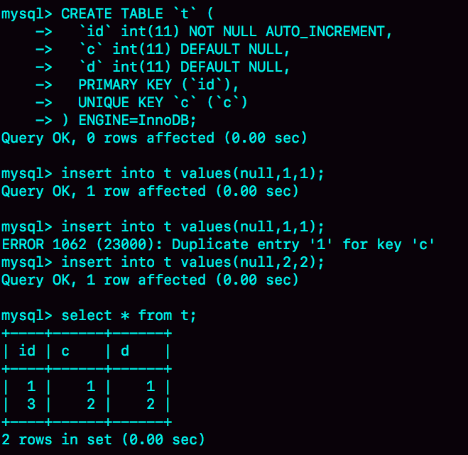 - 继续执行插入数据操作,由于已经存在c=1的记录,所以报Duplicate key error,语句返回。